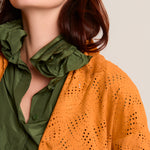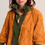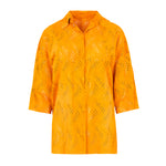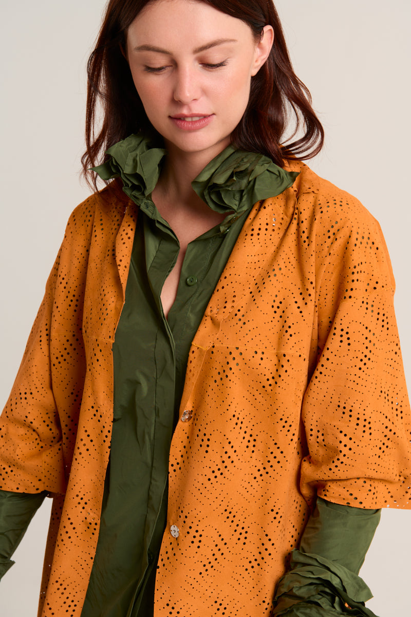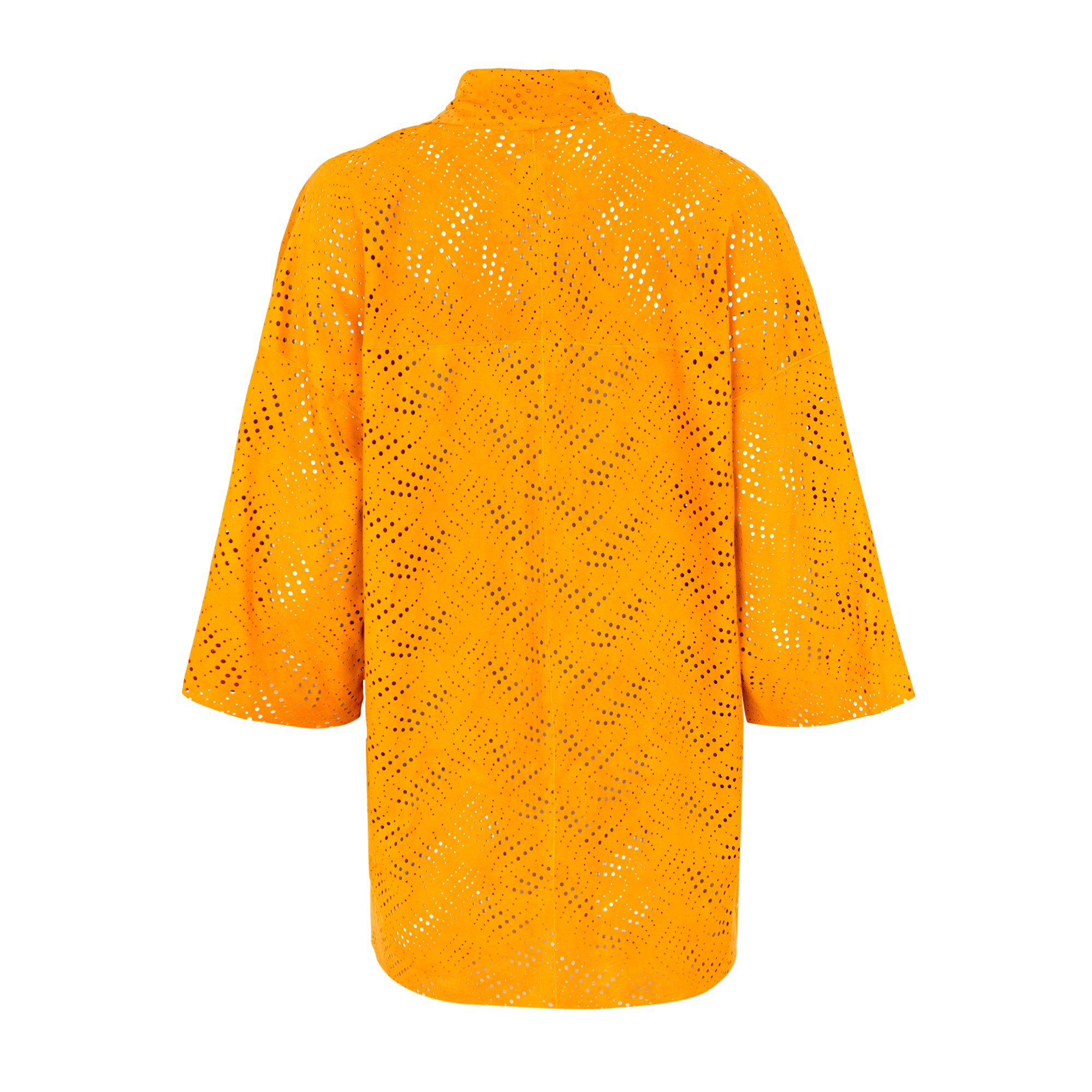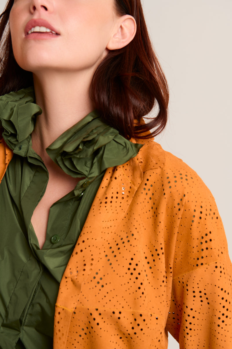 Spanish lambskin frock coat with a die-cut suede finish, a shirt collar, short sleeves, and a snap button closure. Orange/Mango color. Composition: 100% Spanish lamb. Made in Spain.