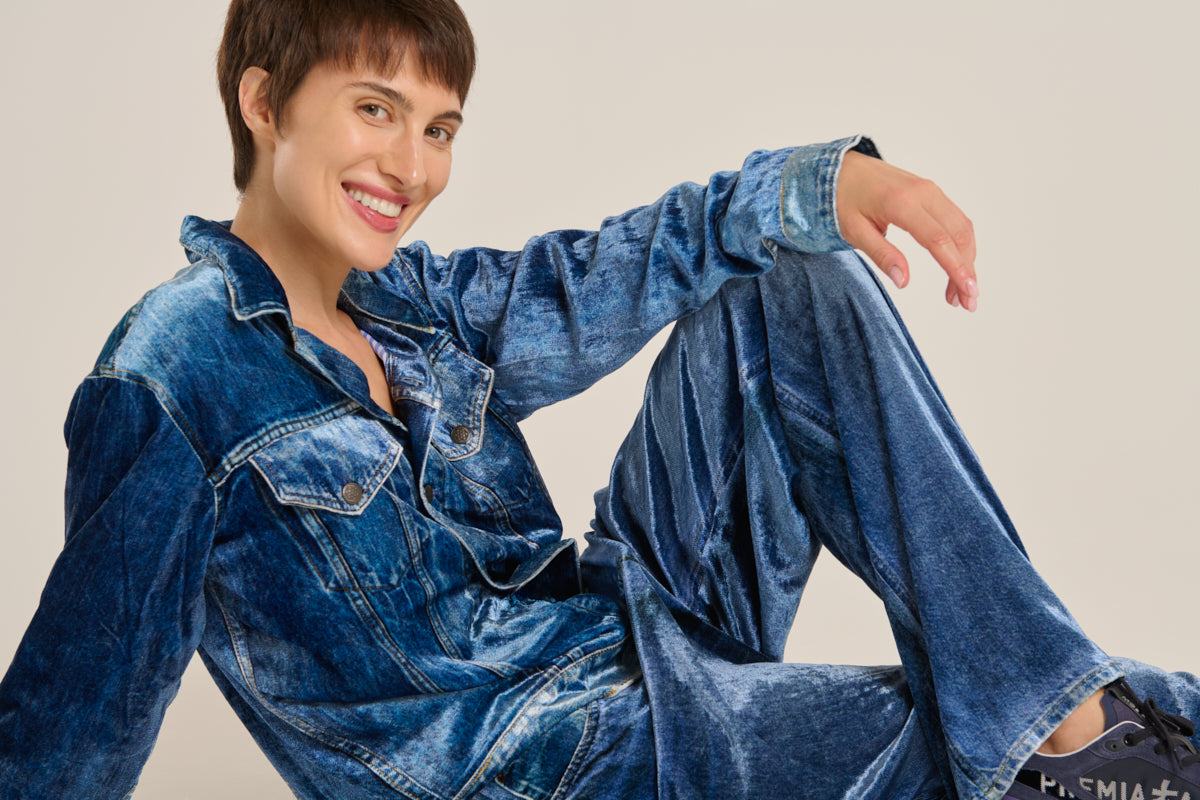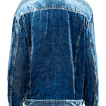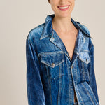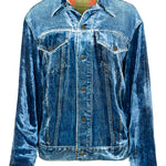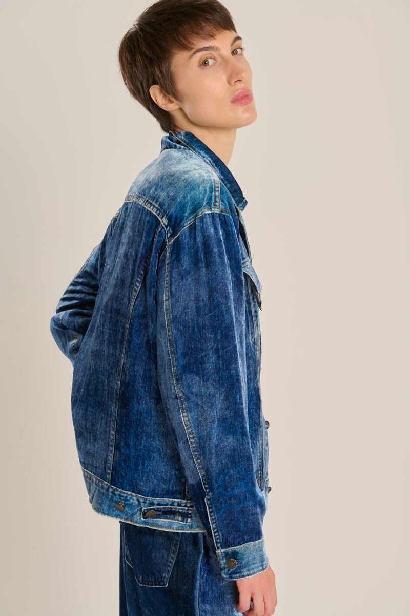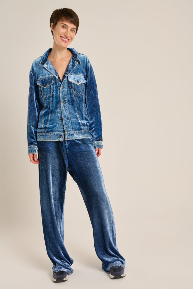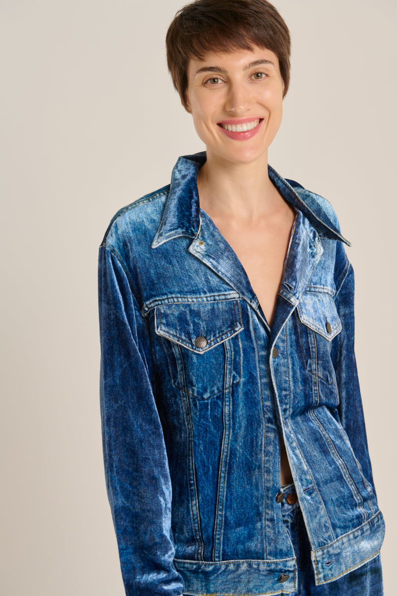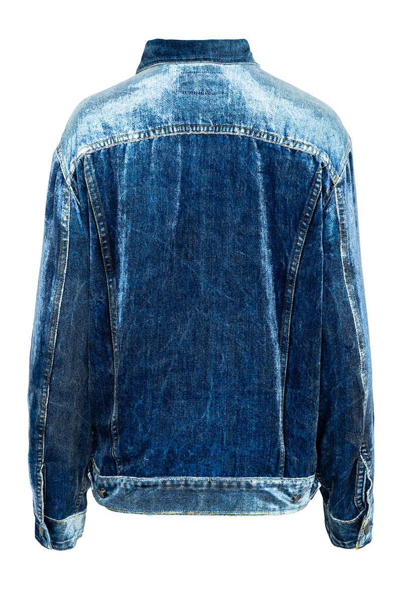 Slightly oversized velvet jacket, with a denim cut and worn effect. Interior lining detail with white and blue stripes. Composition: 82% viscose 18% silk. Made in Italy. Italian sizing.
