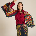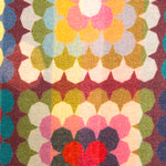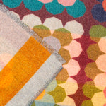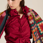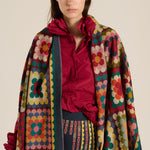 Pañuelo estampado de Franco Ferrari doble faz. Estampado crochet multicolor y el reverso en rayas en tonos mostaza, verde, azul y grana. Composición: 85% lana, 15% cashmere. Medidas: 65x 195. Hecho en Italia.