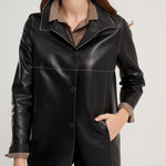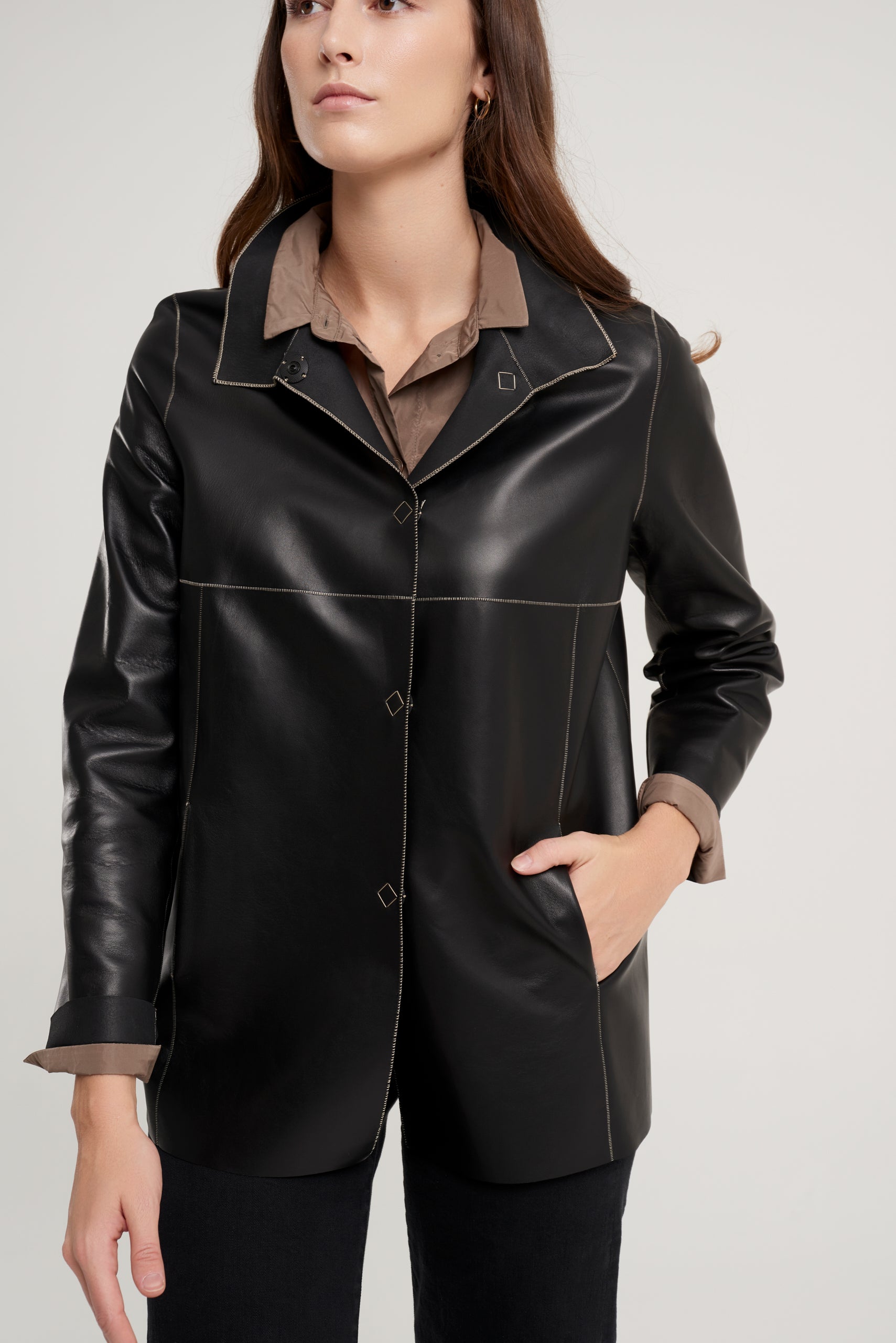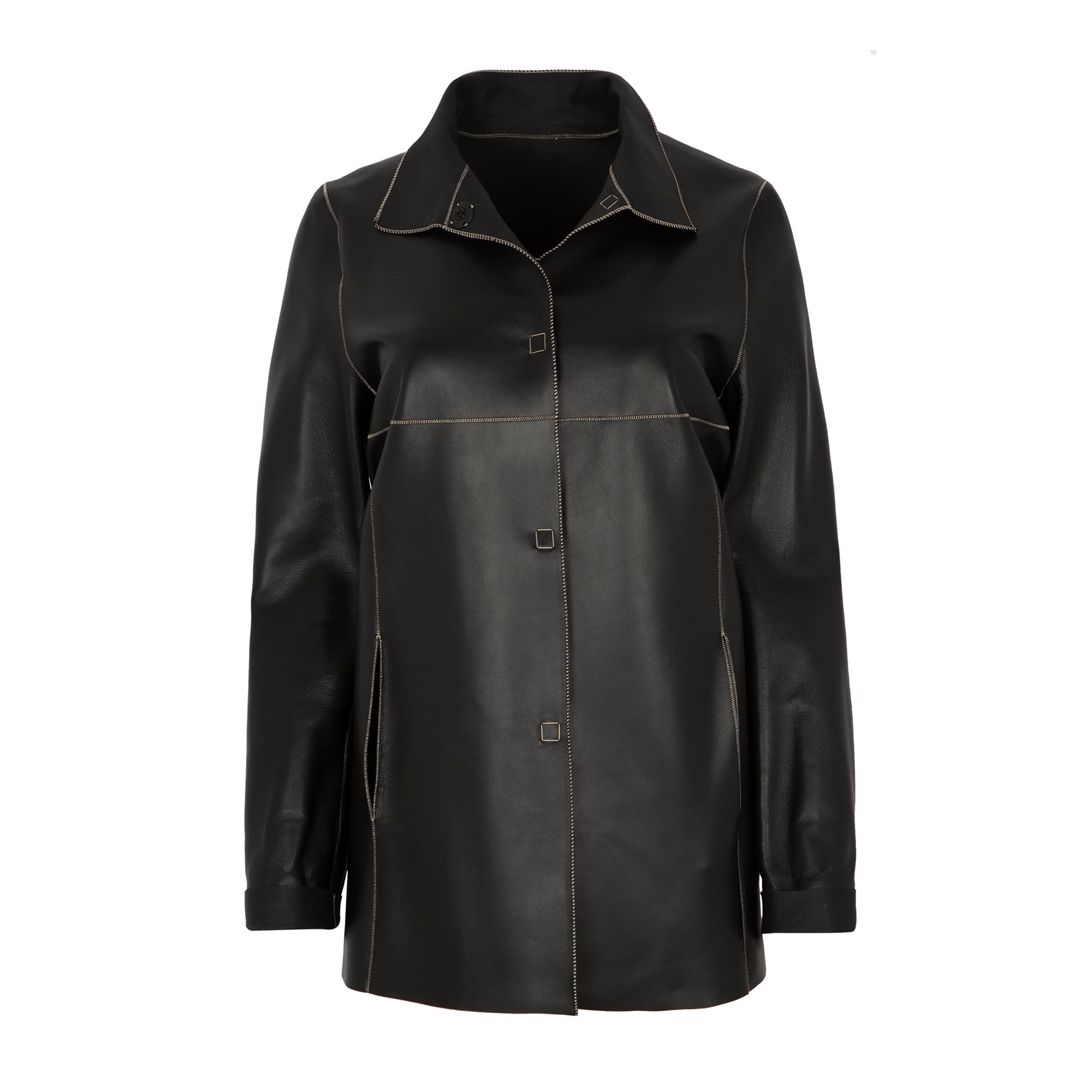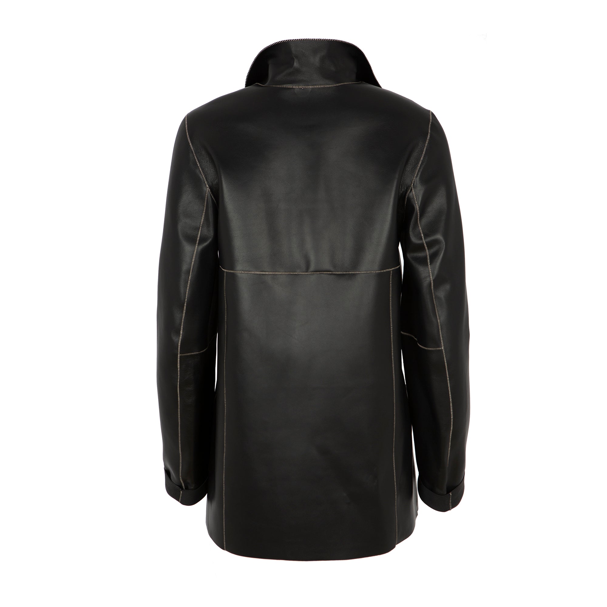 Spanish lambskin frock coat with nappa leather finish and shirt collar. Black. Snap button closure.