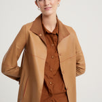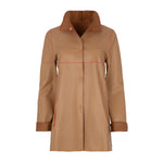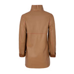 Spanish lambskin frock coat with a nappa leather finish and a shirt collar. Camel color with orange thread detailing. Snap button closure.
