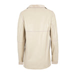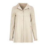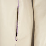 Spanish lambskin frock coat with a nappa leather finish and a shirt collar. Ecru color with purple thread detailing. Snap button closure.