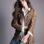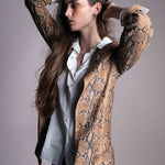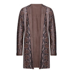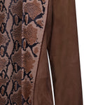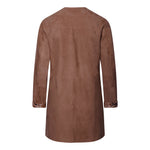 Spanish lambskin frock coat with a tobacco-colored suede finish. Reversible with an animal print.