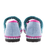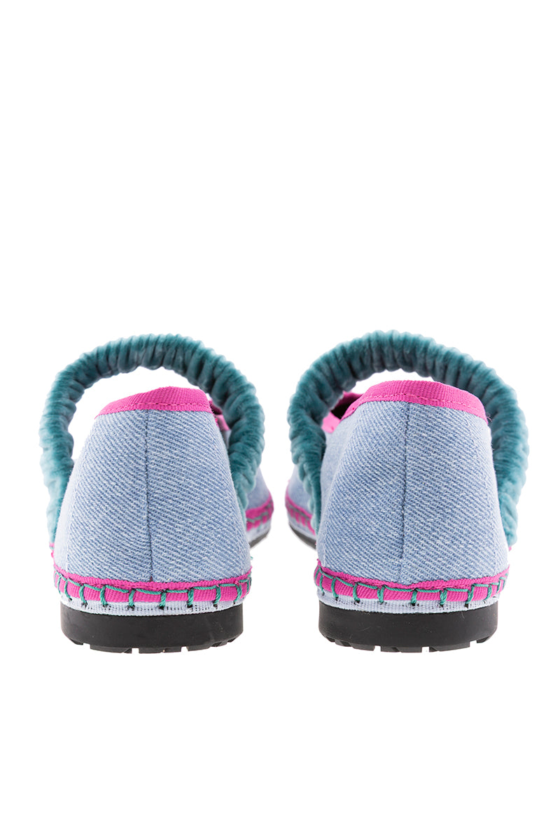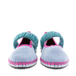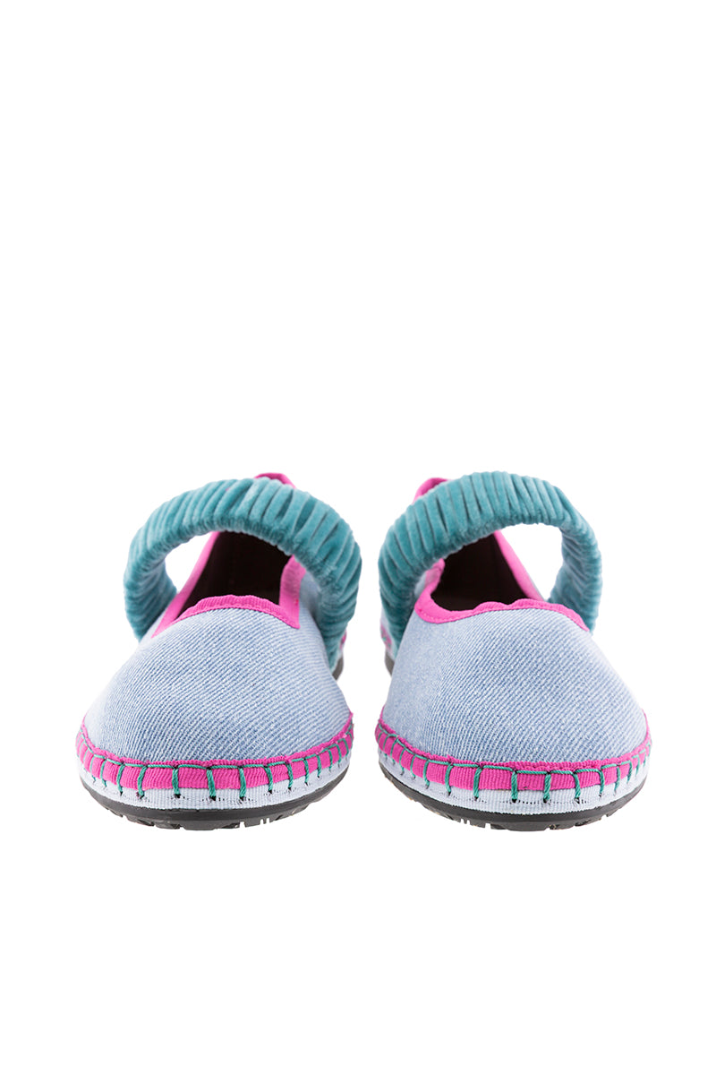 Mafalda ballerina in cotton denim from the capsule collection created for Alfaro 1926, by the Spanish brand Flabelus. Design with a round neckline and blue jean velvet elastic strap over the instep. Denim color and blue jean stitching with grosgrain trims and a fuchsia and blue sole. Composition: outer 100% cotton velvet, inner 100% organic cotton, and the sole is made of rubber produced from recycled bicycle tires. Antibacterial treatment. If you are between two sizes, always choose the larger one.