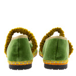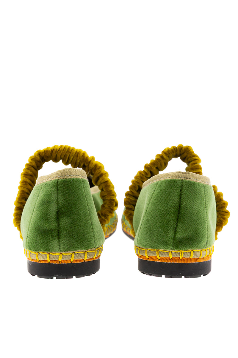 Mafalda ballet flat in cotton velvet from the capsule collection created for Alfaro 1926, by the Spanish brand Flabelus. Design with round neckline and elastic velvet strap in mustard over the instep. Loden green color and mustard stitching with grosgrain trims and sole in toasted and orange. Composition: outer 100% cotton velvet, inner 100% organic cotton, and the sole is made of rubber produced from recycled bicycle tires. Antibacterial treatment. If you are between two sizes, always choose the larger one.