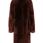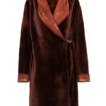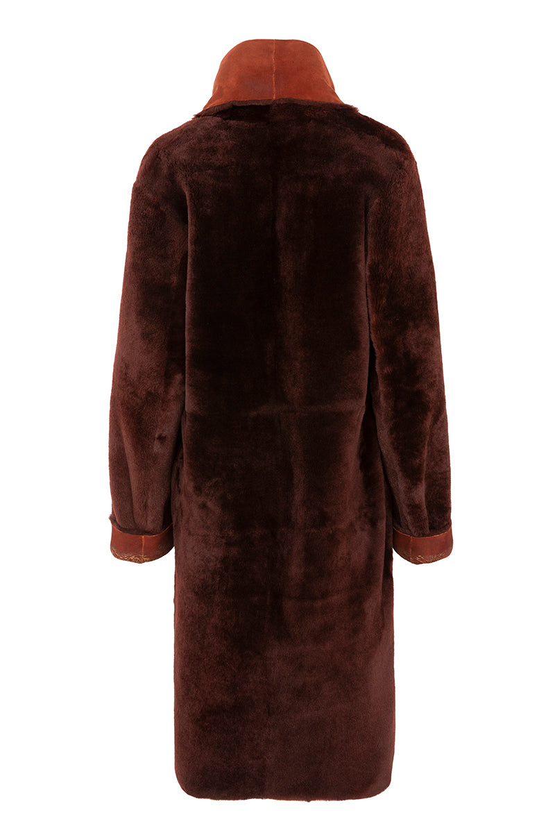 Abrigo de piel de cordero merinillo pintado . Modelo cruzado con cuello chal , bolsillos ocultos en costuras y largo midi . Cierre con presillas de piel y botón . Color marrón quemado con pequeños dibujos pintados en dorado mate . Composición: 100% piel de cordero merinillo .