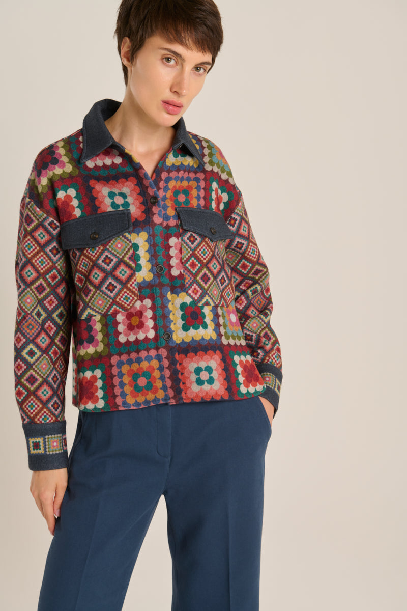 Sobrecamisa corta de lana con bolsillos delanteros, tapilla y cuello a contraste. Estampado cuadros granny multicolor sobre fondo azul grisáceo. Composición: 100% Lana. Tallaje italiano. Hecho en Italia.