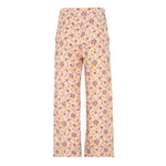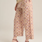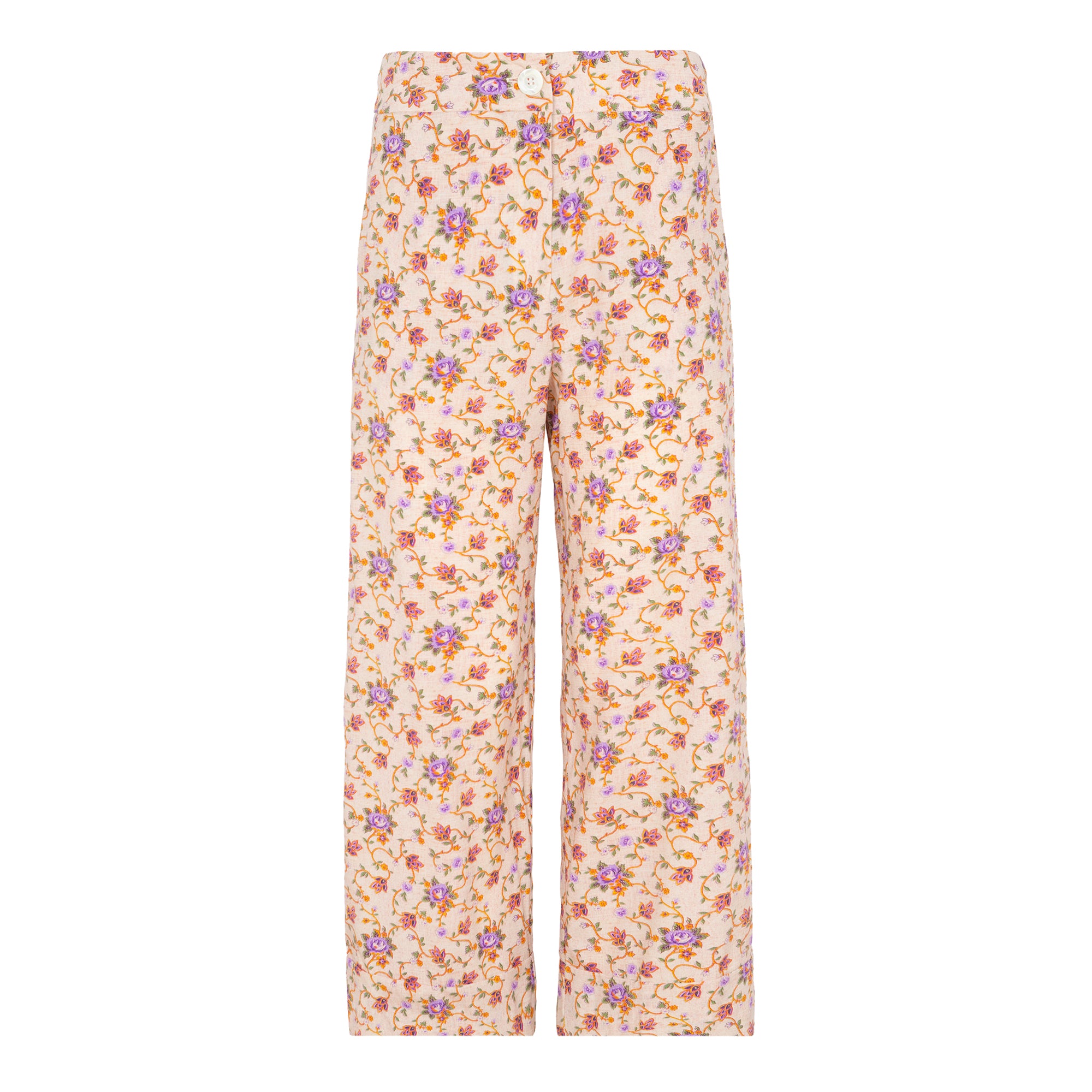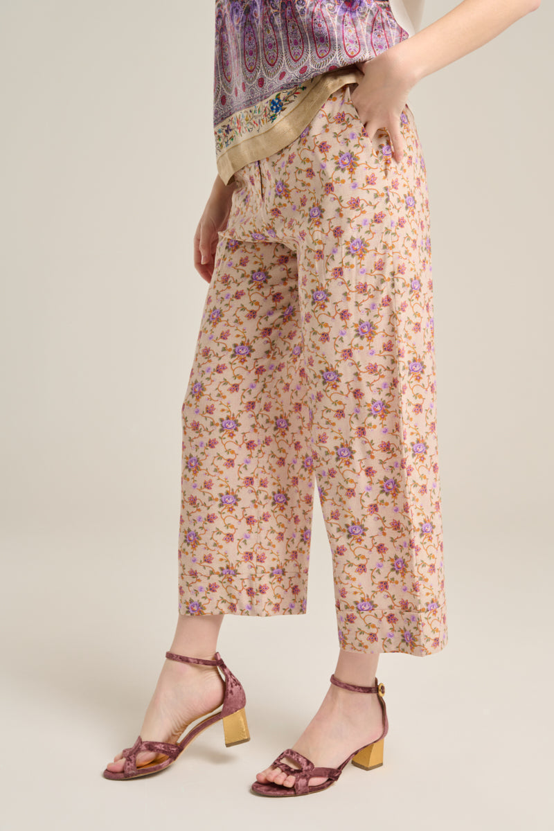 Straight-cut cropped trousers from the Italian brand Pierre Louis Mascia, featuring two front pockets, two back pockets, and a turned-up hem. Featuring a floral print in shades of lilac, green, orange, and yellow on a beige background. Composition: 93% silk, 7% elastane. Italian sizing. Made in Italy.