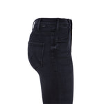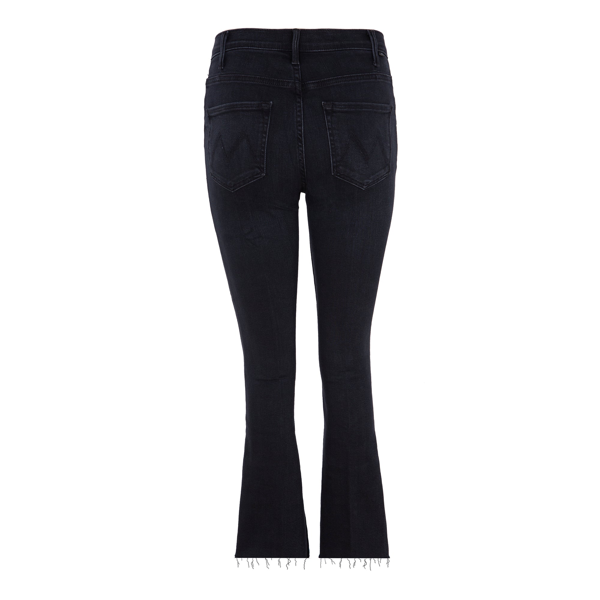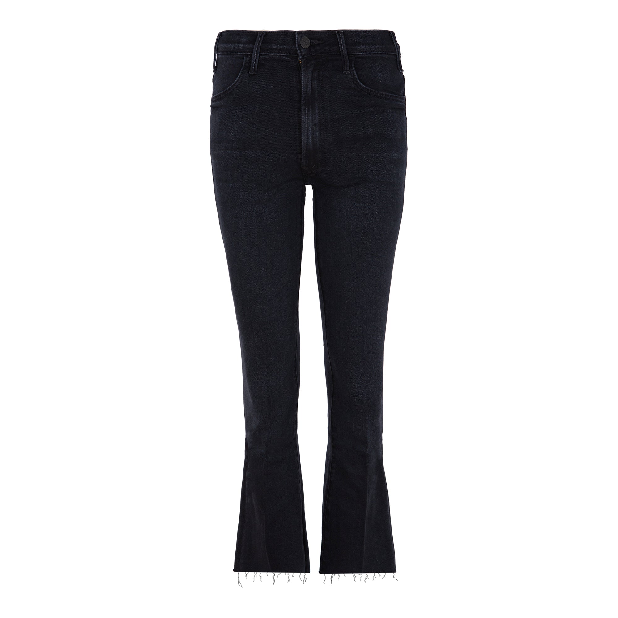 Slightly flared high-waisted jeans, hustler “ankle fray” model, almost black midnight blue color. Front zipper closure and fringed hem. Composition: 71% Cotton, 23% Modal, 4% Polyester, 2% Elastane. American sizing.