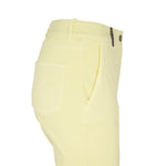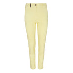 Lemon-colored, high-waist, washed-effect chino pants. Front zipper closure, belt loops, side and back pockets. Frayed finish on the hem Composition: 98% cotton, 4% Elastane, Italian sizing.