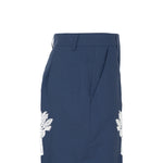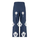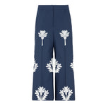 Maison Common palazzo-style, capri-length trousers in navy blue with cotton-thread embroidered palm tree insets. Front zip closure. Side welt pockets. Composition: 60% acetate, 40% viscose.