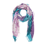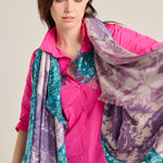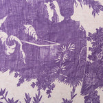 Pierre-Louis Mascia scarf in natural silk. Printed with pastoral motifs, characteristic of toile de jouy, in violet and stone in the center and a floral print border in petrol green and stone around it. Composition: 100% silk. Medium fraying. Size: 135 x 195 cm. Made in Italy.
