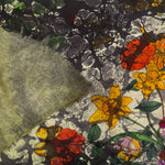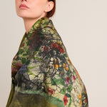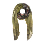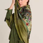 "Quadrello" cashmere knit scarf with a silk centerpiece. Botanical print in shades of green. Limited edition. Composition: 70% Cashmere, 30% Silk. Made in Italy. Measurements: 130 x 110 cm.