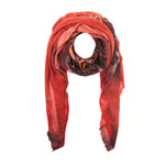 "Quadrello" cashmere knit scarf combined with silk in the center. Abstract print in rust tones. Limited edition. Composition: 70% Cashmere, 30% Silk. Made in Italy. Measurements: 130 x 110 cm.