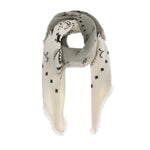 Knitted scarf in a khaki and ecru gradient with a black bandana print. Short fringe trim. Measurements: 105cm x 105cm. Composition: 100% Cashmere.