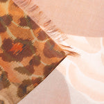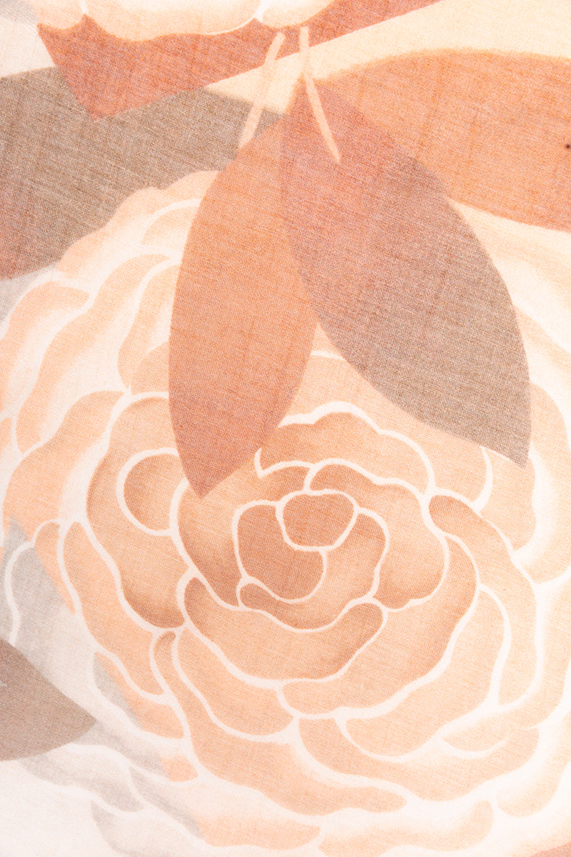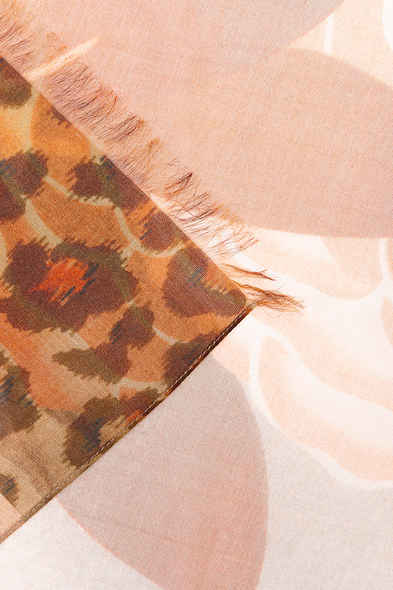 Pierre-Louis Mascia scarf. Floral print with animal print in nude, beige, and brown tones. Composition: 73% cotton, 27% silk. Medium frayed edges. Size: 65 x 190 cm. Made in Italy.