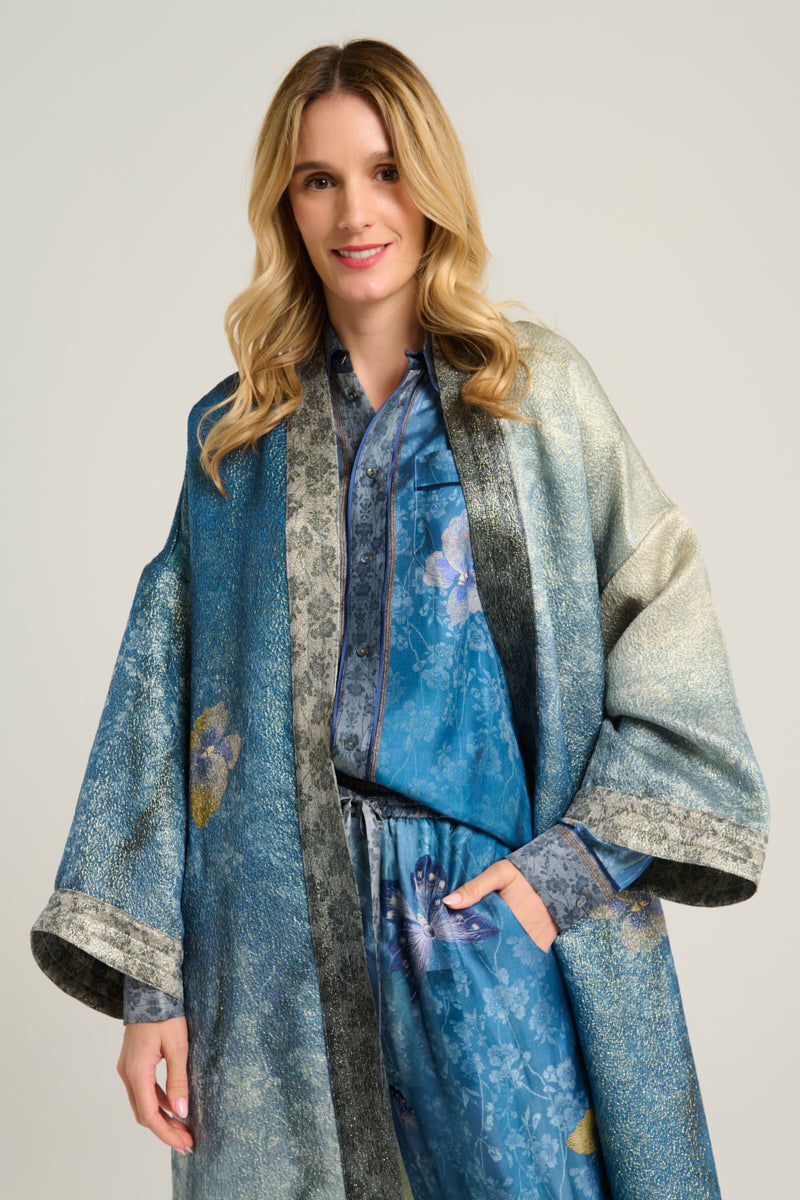Long kimono with a wide, flowing silhouette and Japanese-inspired feel, relaxed drape, and wide 3/4 sleeves. The neckline is a deep V-neck without fastening, finished with a wide contrasting facing. Butterfly print over a gradient background in blue tones with a washed watercolor effect. Fabric with a subtle, slightly satin sheen. One size. Composition: 40% Wool, 19% Polyester, 16% Silk, 13% Polyamide, 12% Cotton. Italian sizing. Made in Italy.