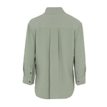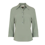 Camisa estilo polera con manga francesa y aberturas laterales. Color verde caza. Composición: 50% seda, 50% acetato. Hecho en Italia.