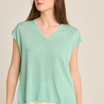 Jersey estilo poncho oversize con cuello pico, manga corta y aberturas laterales. Color verde con hilo metalizado. Composición: 65% Lyocell, 15% poliester, 12% Cashmere, 8% hilo metálico.