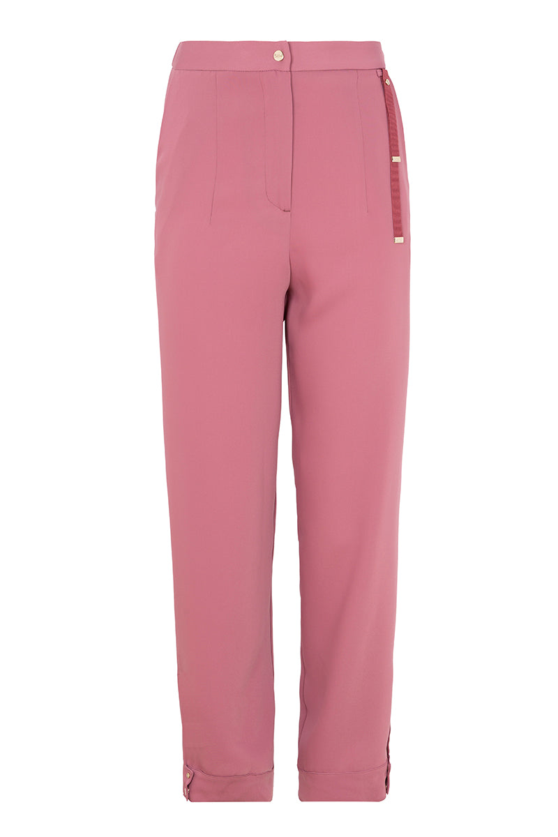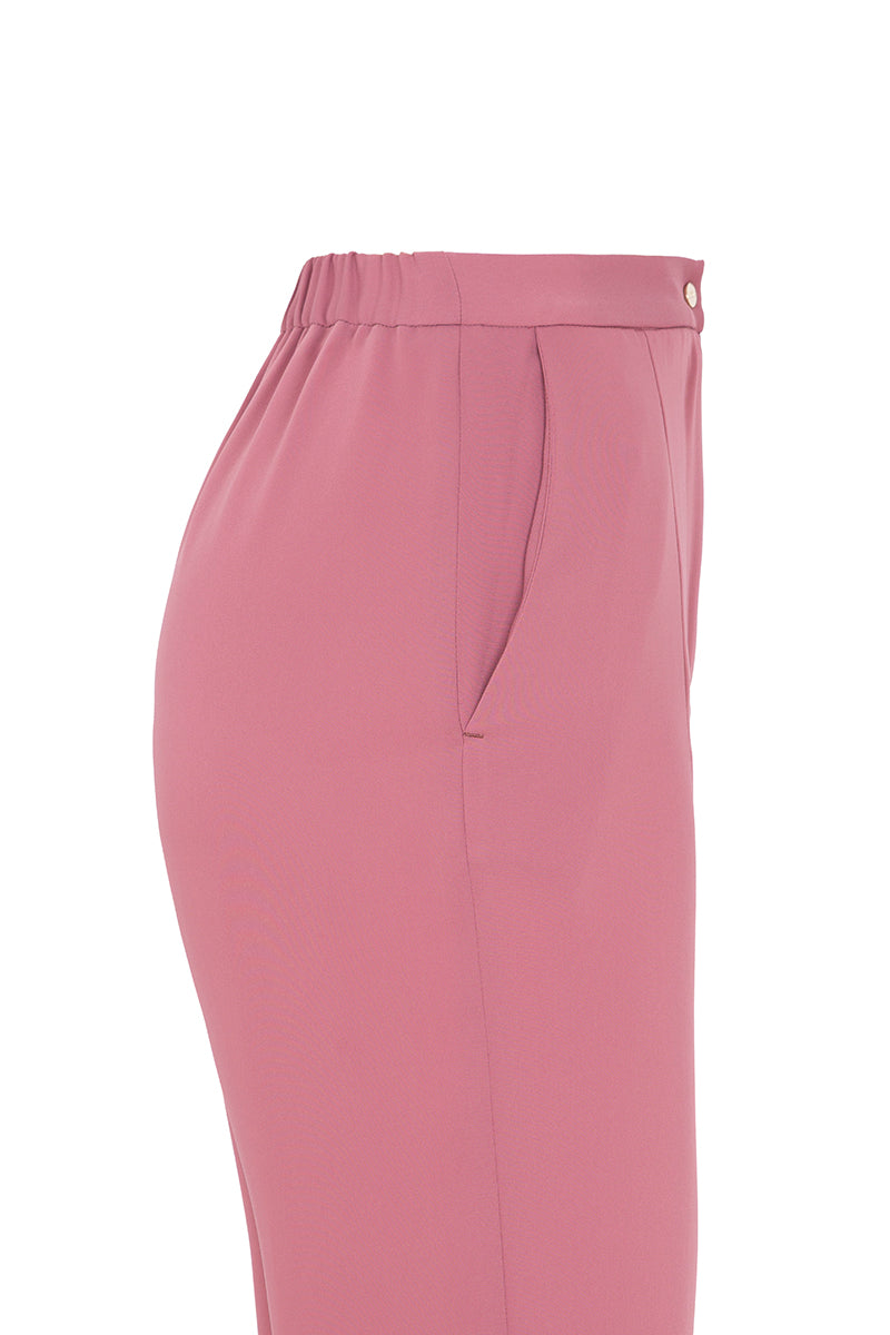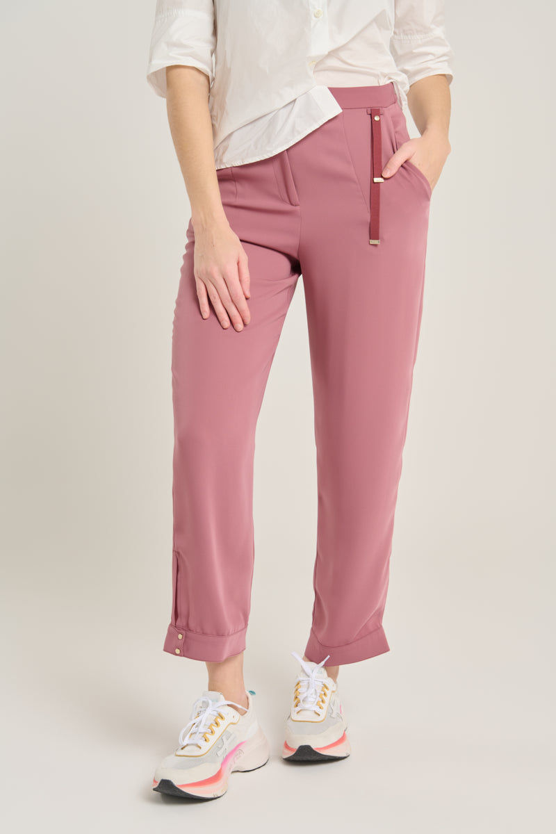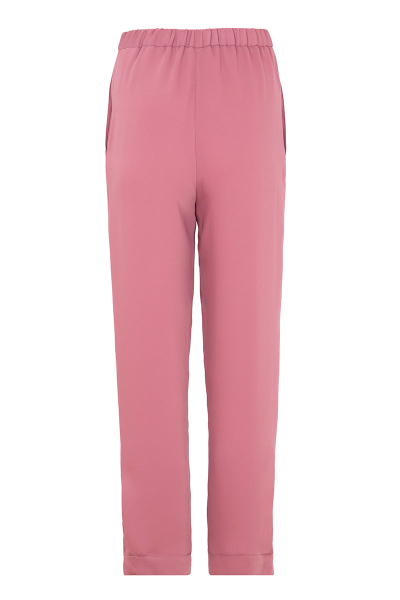 Trousers from the Italian brand Herno in pink powder Cady fabric. Straight cut with elastic at the back and side pockets. Front closure with zipper and snap button. Small decorative detail in matching grosgrain ribbon. Hem with side slit and snap closure. Composition: 100% polyester. Italian sizing. Made in Italy.