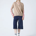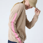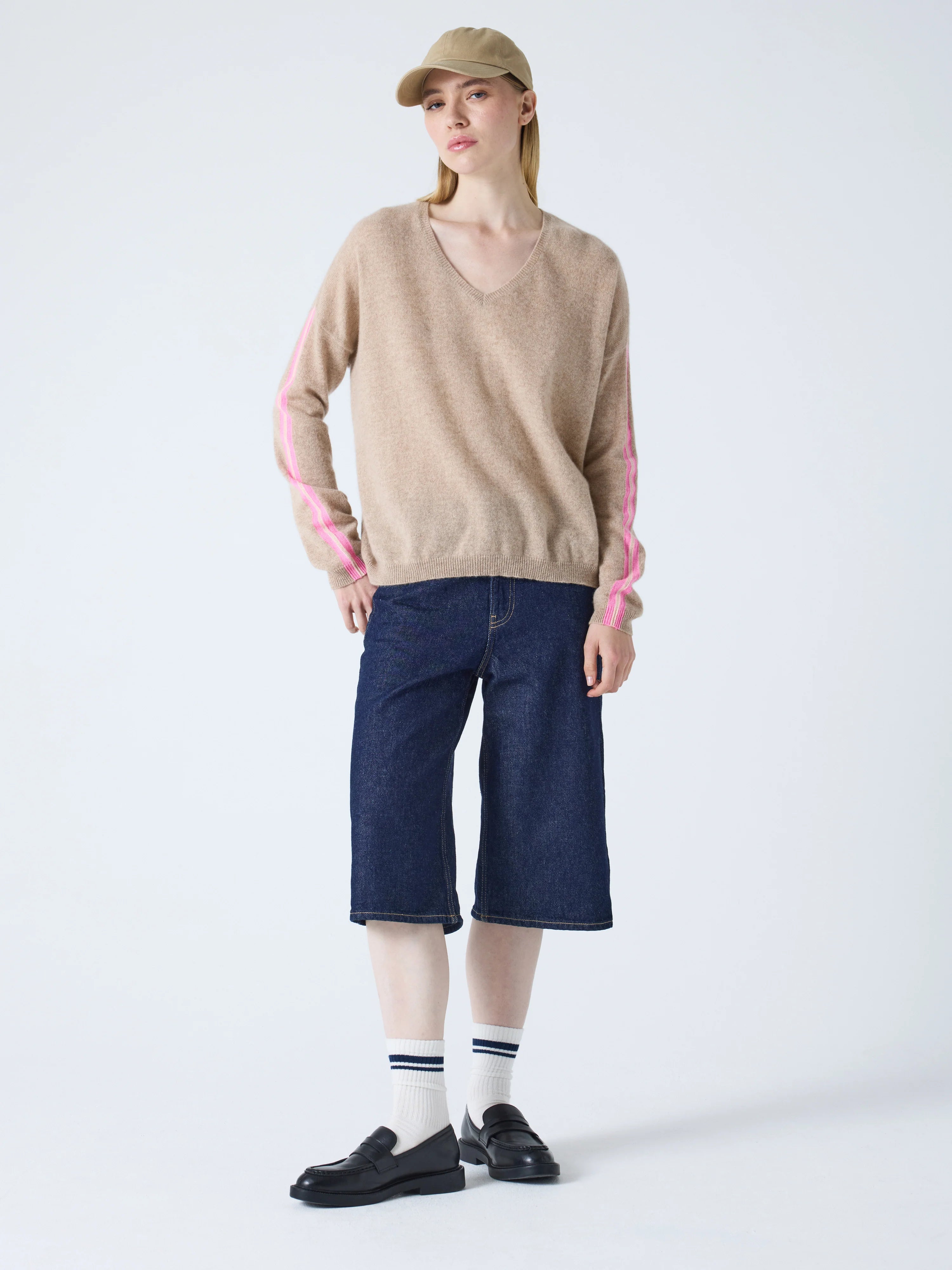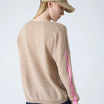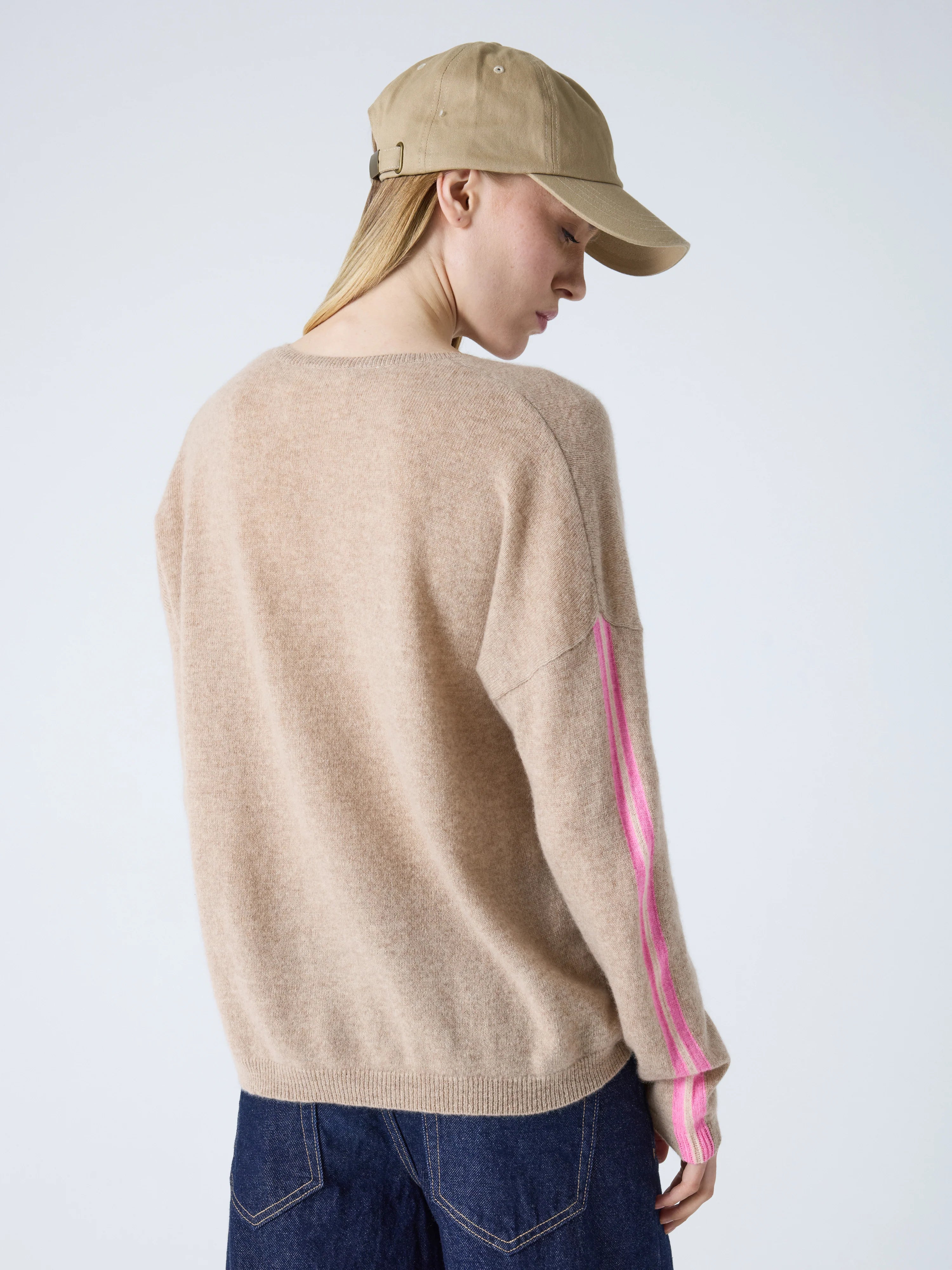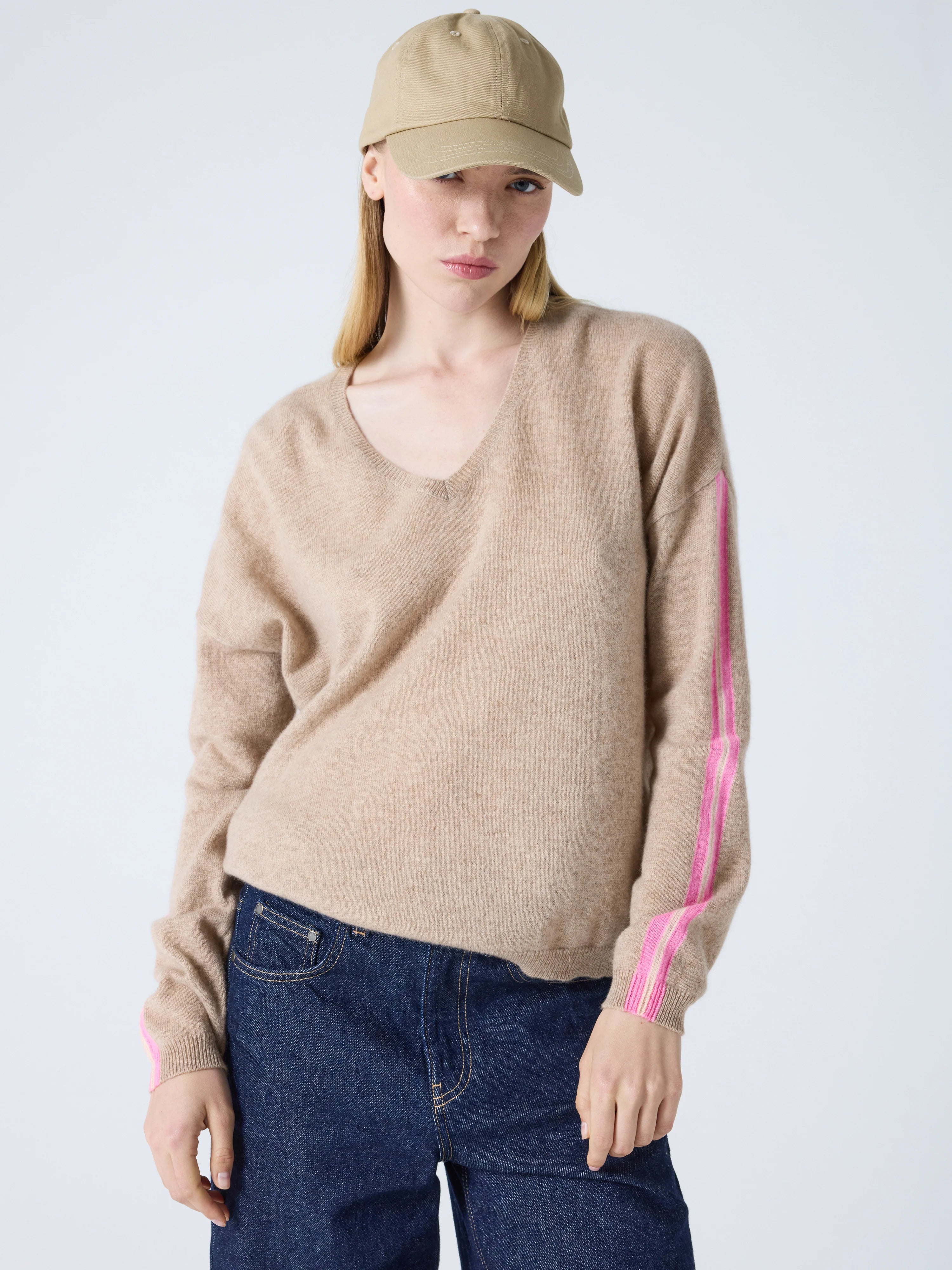 Oversized sweater with a V-neck and long sleeves, from the French brand Absolut Cashmere. Beige color with pink stripe details on the sleeves. Composition: 100% cashmere