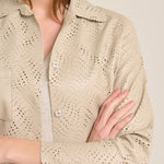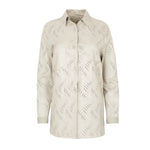 Spanish lambskin overshirt with a die-cut nappa leather finish, shirt collar, long sleeves, and snap button closure. Patch pocket in smooth nappa leather. Stone color. Composition: 100% Spanish lamb. Made in Spain.