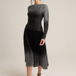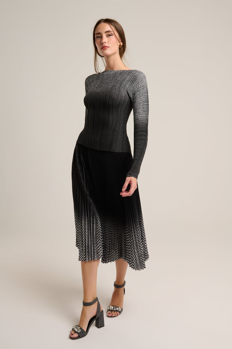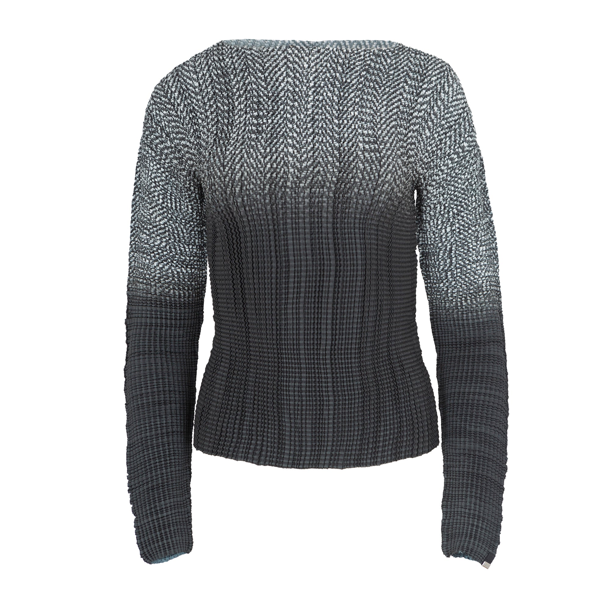 Herno sun-pleated top with a round neckline and long sleeves. Black and white gradient with a knit-like print. Composition: 100% polyester. Italian sizing. Ref. BL000012D 12675-9480