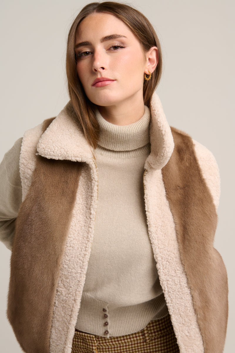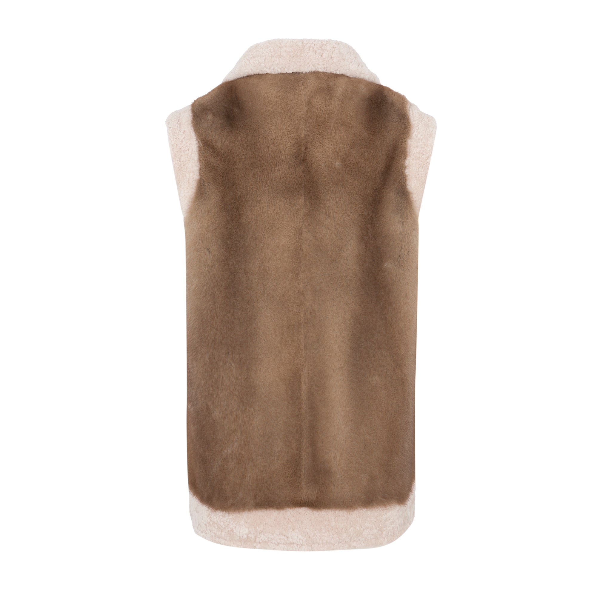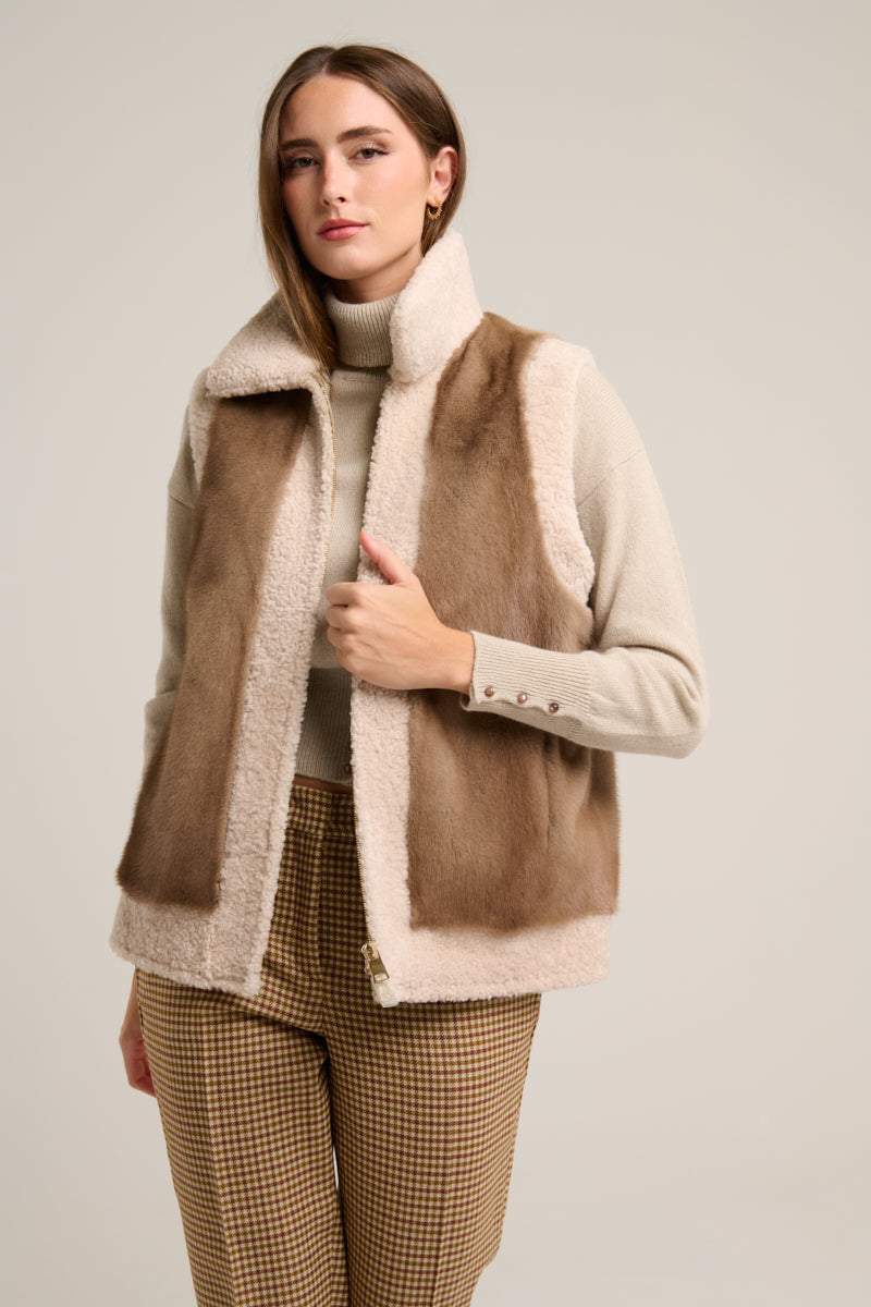 Short mink vest in natural color. Combination of mink and lamb in sand and ecru. Zip closure and side pockets. Cashmere lining. Composition: 100% Mink, 100% Lamb, 100% Cashmere. Italian sizing. Made in Italy.