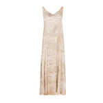 Vestido largo sin mangas, escote pico y ligeramente evasé. Efecto amarmolado en dorado sobre fondo beige. Composición: 94% seda, 6% seda. Hecho en italia.