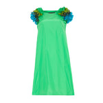 Green A-line dress with a boat neck, sleeveless design, and side pockets. Overlapping shoulder pads in turquoise taffeta and various shades of green. Detachable shoulder pad. Composition: 100% polyester. This fabric cannot be ironed. German sizing.