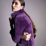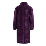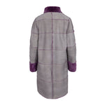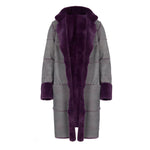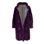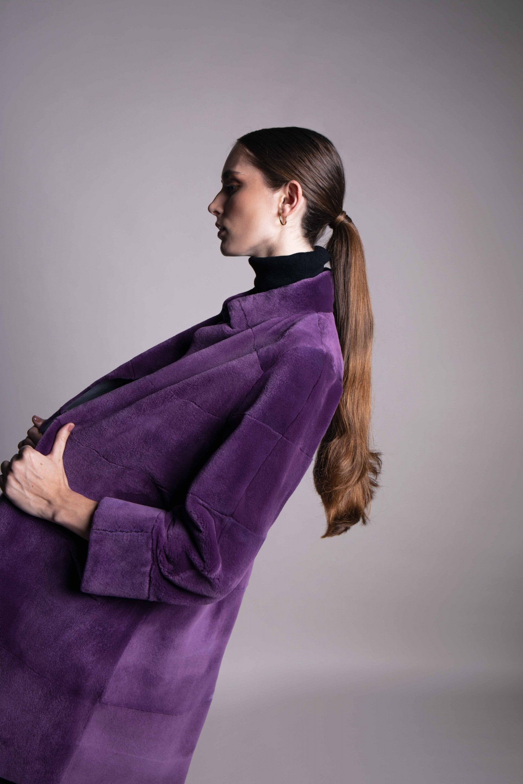 Unstructured shaved mink fur coat with a high lapel and a reversible, natural finish. Flowing pattern and reinforced interior pockets in amethyst-colored nappa leather.