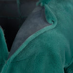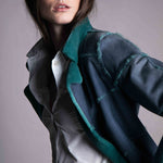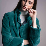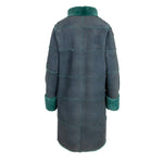 Unstructured, shaved mink fur coat with a high, reversible lapel and ocean blue finish.