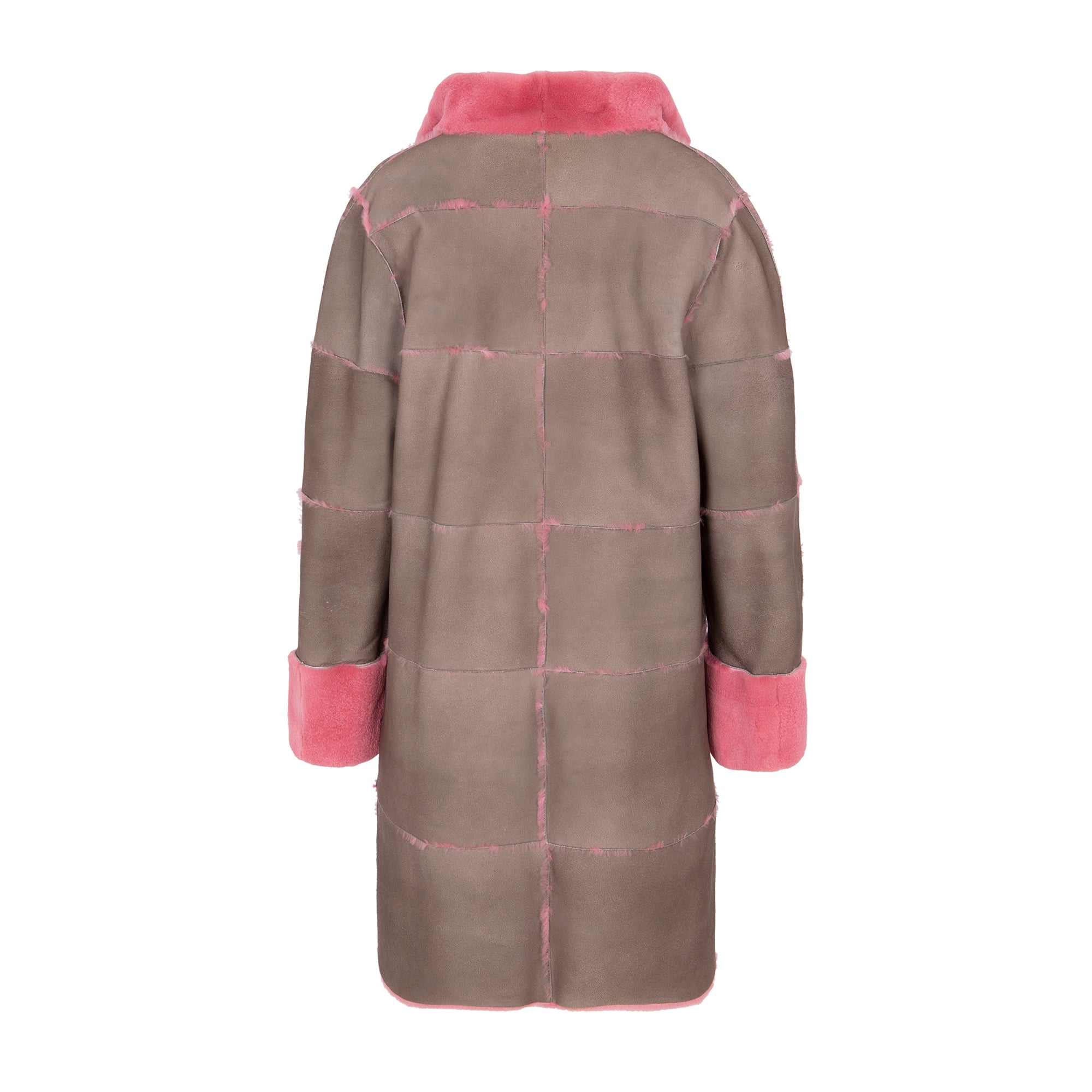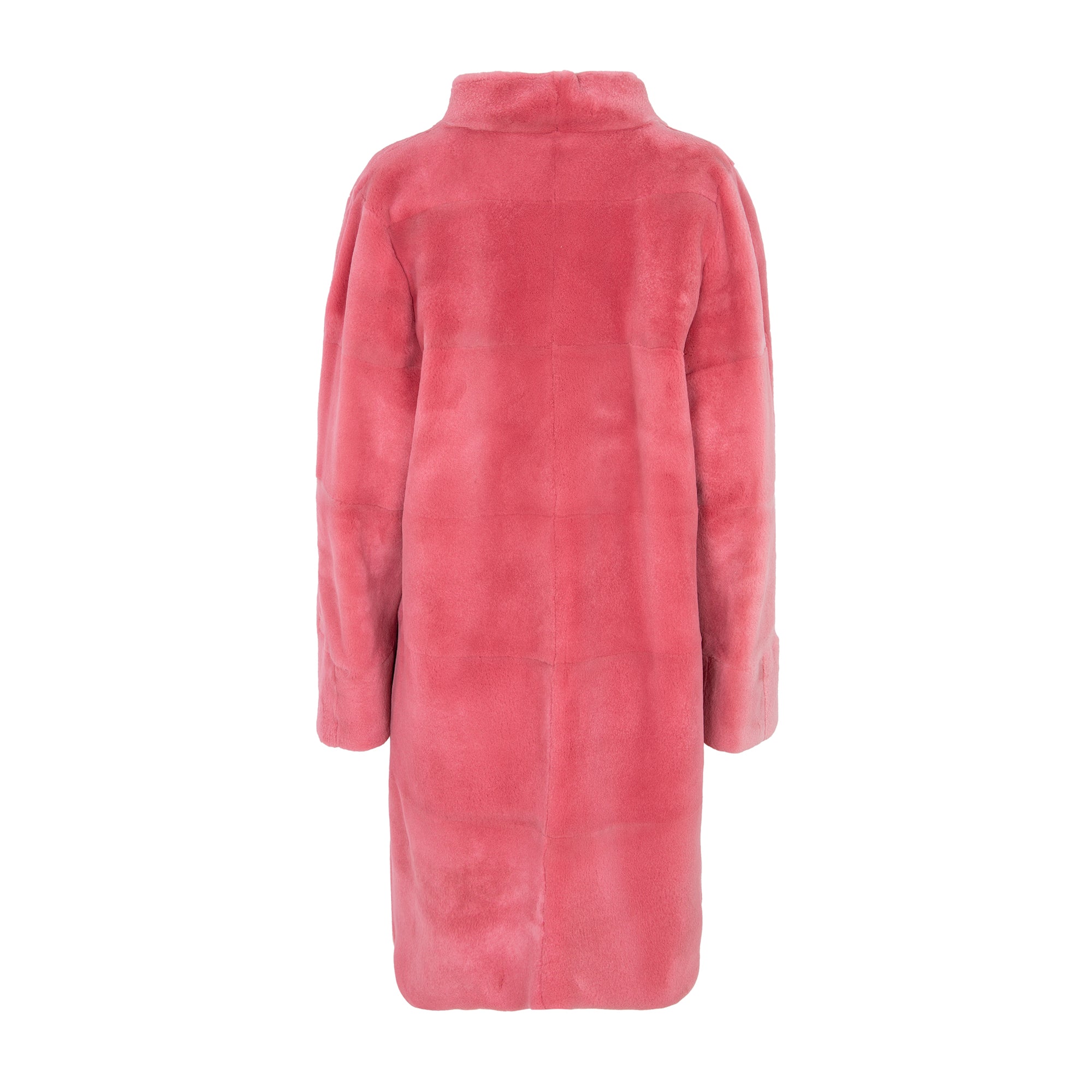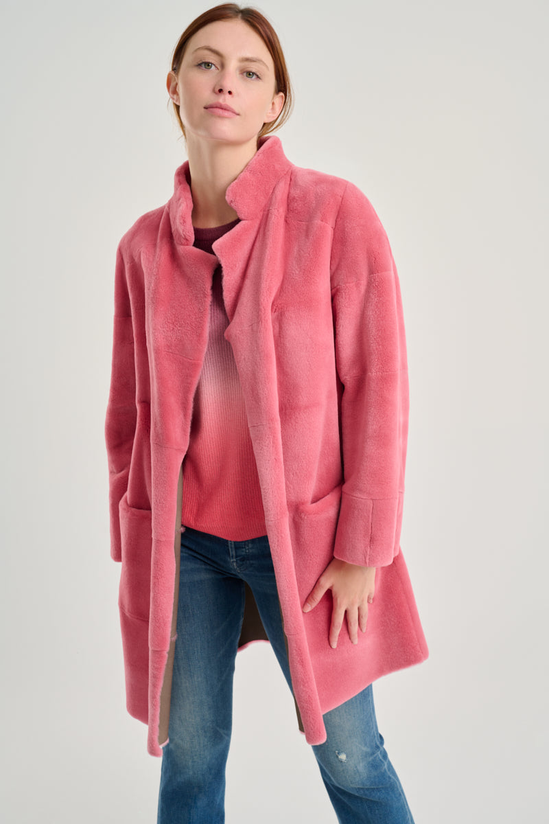 Unstructured shaved mink fur coat with a high lapel and a reversible gray finish. Flowing pattern and reinforced interior nappa leather pockets. Pink.