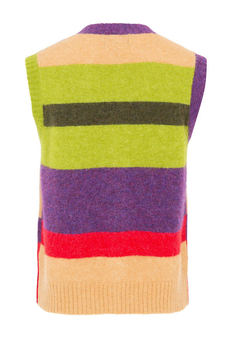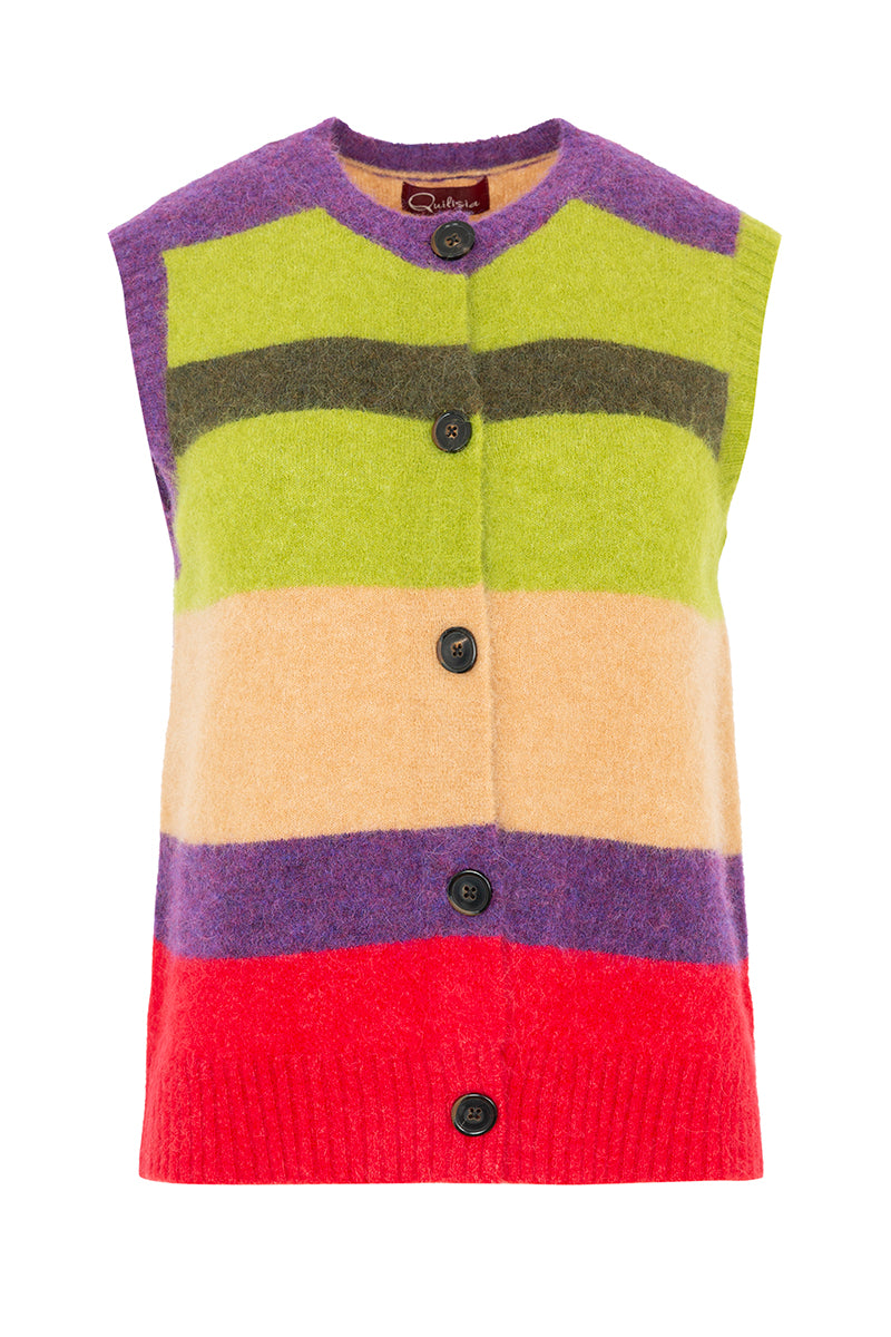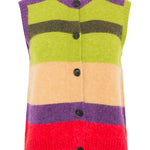 Multicolor striped knit vest in shades of green, beige, purple, and red. Composition: 73% Alpaca, 25% Polyamide, 2% Elastane. Italian sizing. Made in Italy.
