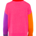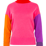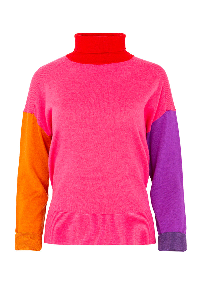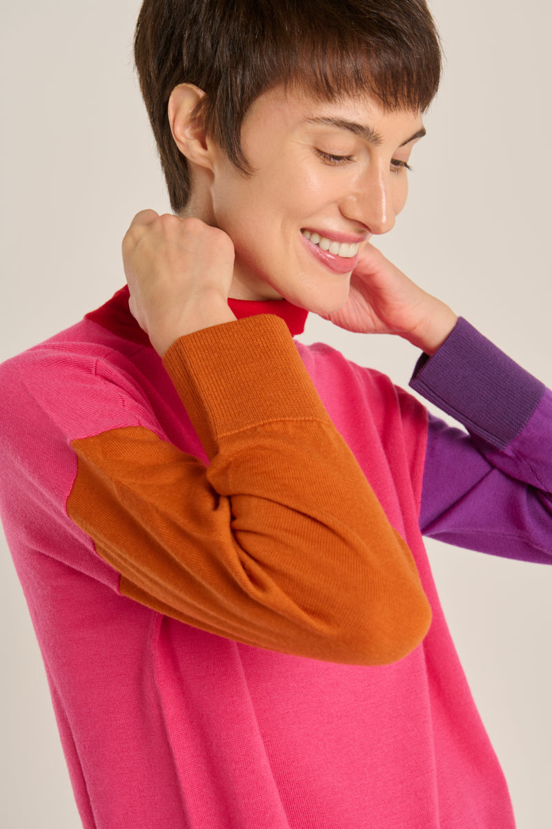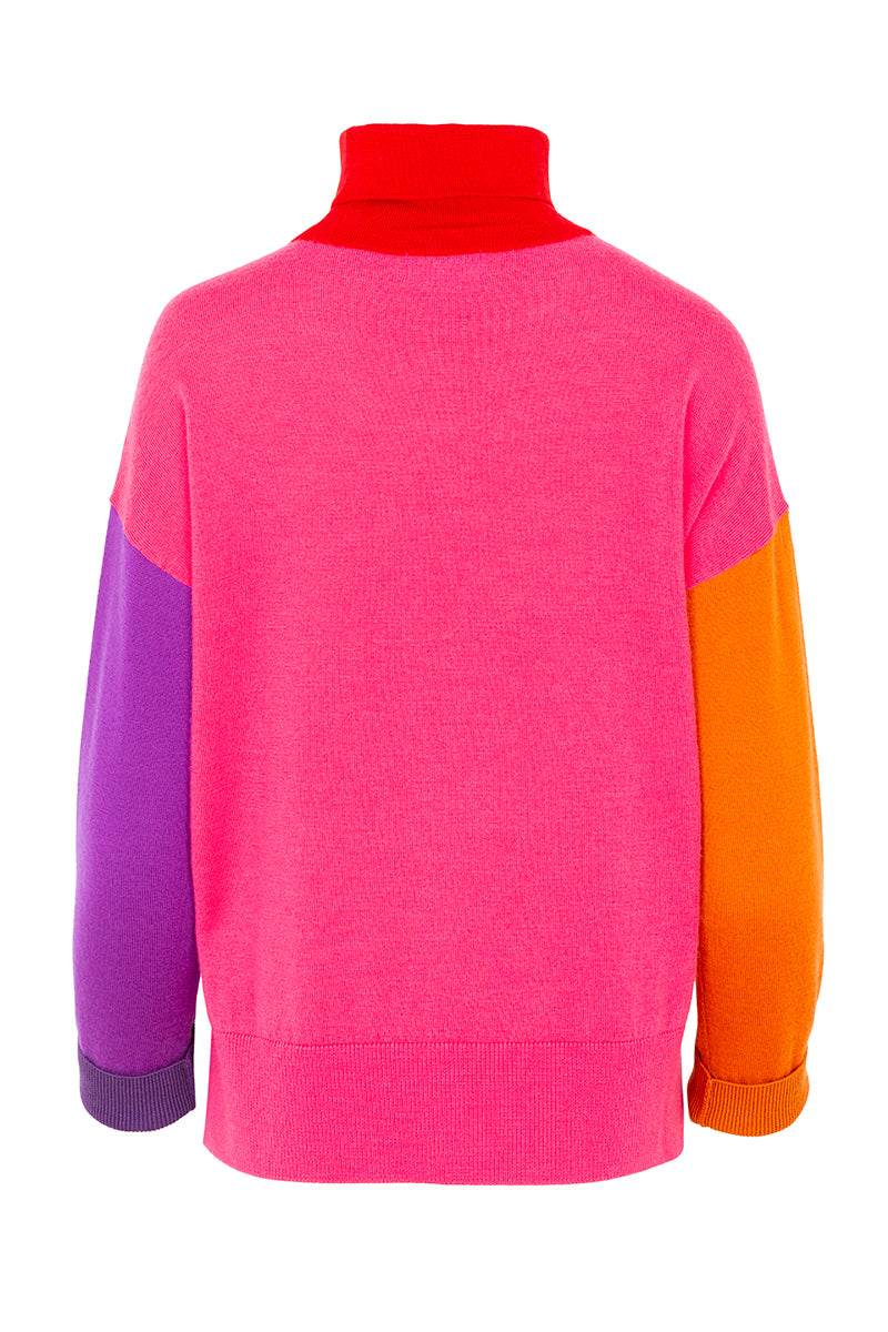 Knitted turtleneck sweater in pink. Contrasting sleeves in kettle and purple tones and a red collar. Slightly oversized with side slits. Composition: 100% extrafine Merino wool. Italian sizing. Made in Italy.