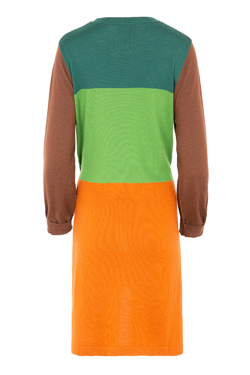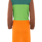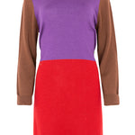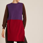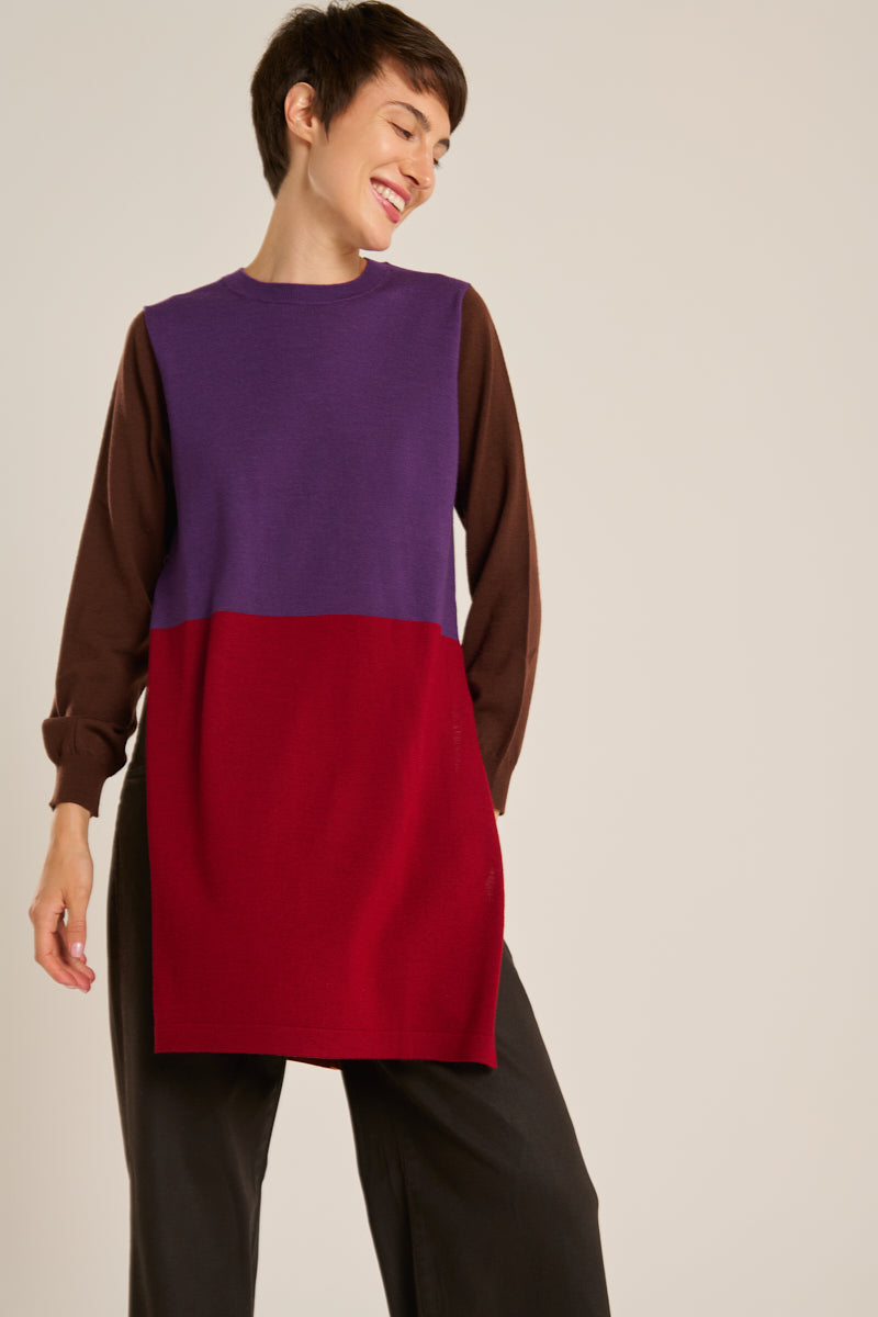 Box neck knit dress, long sleeves, knee-length and asymmetrical. Wide side slits that close with 3 buttons, to wear with pants or skirt. Color block, front in purple and cherry, brown sleeves, and back in two shades of green and rust. Composition: 100% extrafine Merino wool. Italian sizing. Made in Italy.