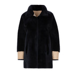 Chaquetón de piel de cordero español acabado en ante. Cuello con cierre imantado, reversible y bicolor en ante topo y azul noche. Botón clip de carey. 100% Cordero español.