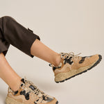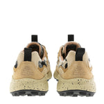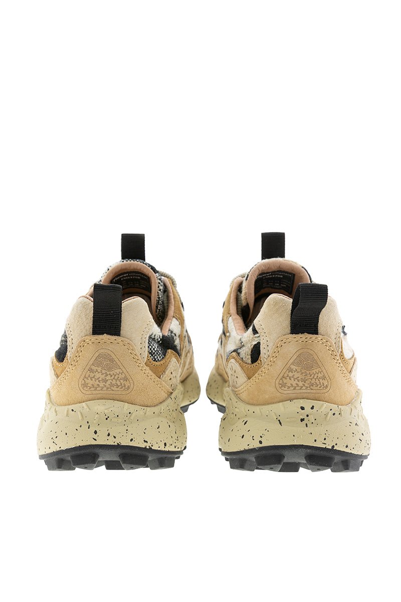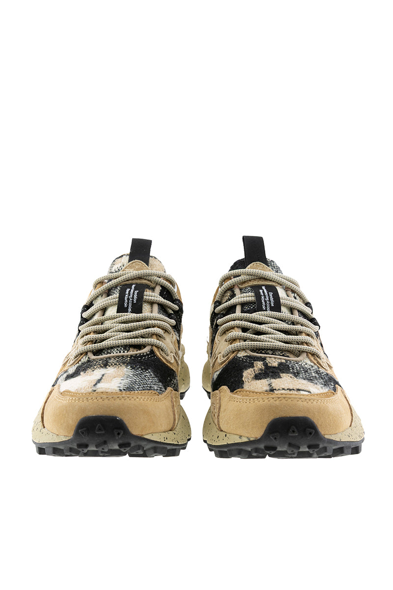 Sneakers from the Japanese brand Flower Mountain. Yamano 3 model. Combination of plaid fabric in black, beige, and off-white tones with beige suede. Black grosgrain details. Beige round trekking-style laces. Natural cork antibacterial insole and ultra-lightweight beige recycled rubber sole with black paint splatters.