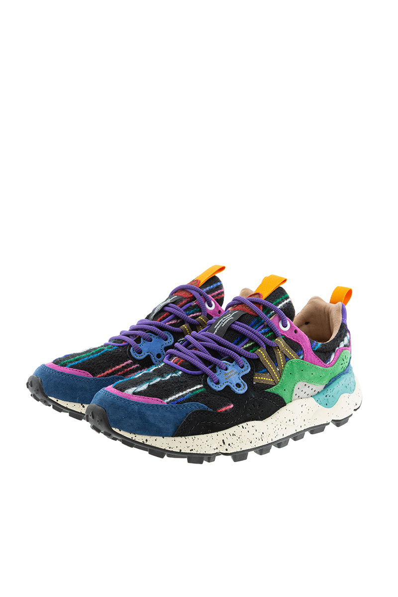 Deportivas de la marca japonesa Flower Mountain. Modelo Yamano 3. Combinación de hilo en lana multicolor sobre fondo negro. Cordones redondos estilo trekking color morado. Plantilla antibacteriana de corcho natural y suela de goma ultraligera dentada en reciclaje beige con pintadas en negro .