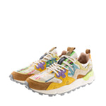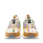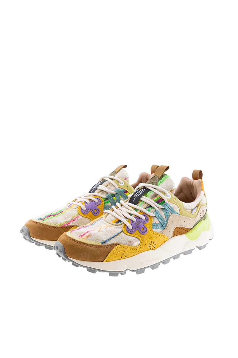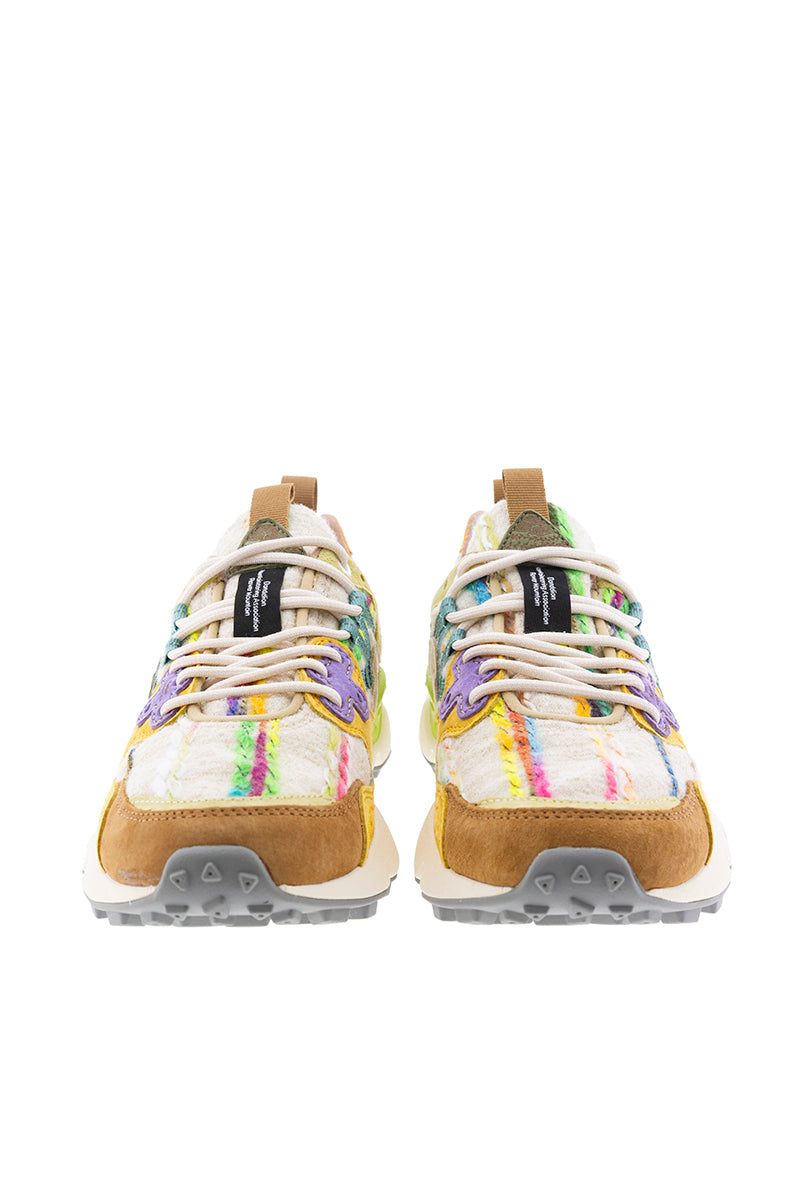 Sneakers from the Japanese brand Flower Mountain. Yamano 3 model. Combination of multicolored wool yarn on a raw background. Beige round trekking-style laces. Natural cork antibacterial insole and ultralight beige recycled rubber serrated sole.
