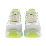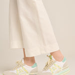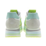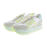 Beth sneaker, version 7374. White nylon upper with a gray and green suede toe and heel. Lime-colored logo with soft green pearls and gray suede heel detail. Two-tone cotton laces. Triple-stitched sole for extra comfort.