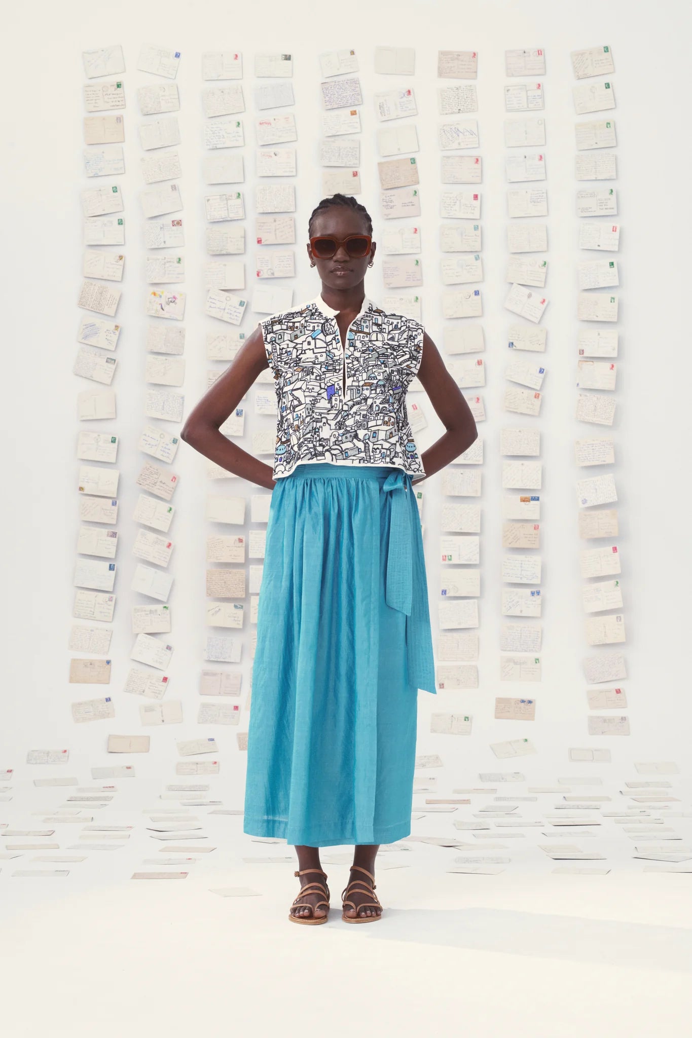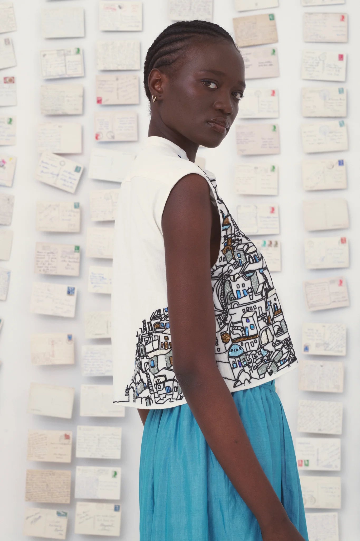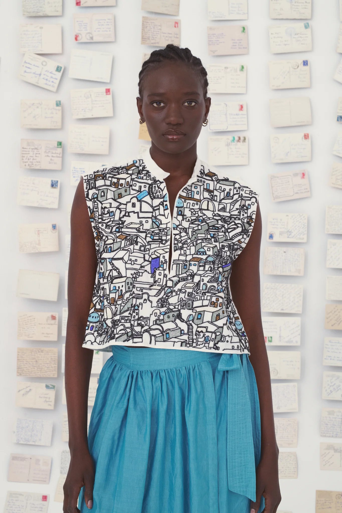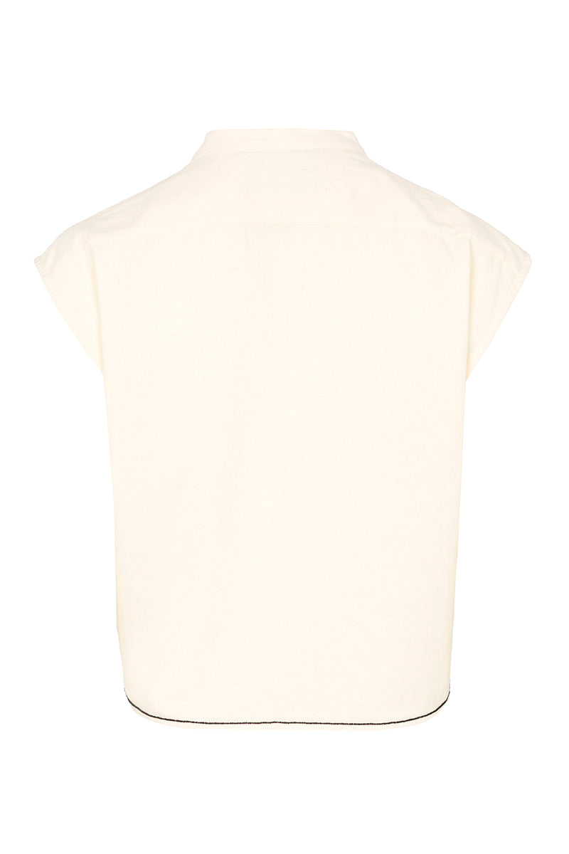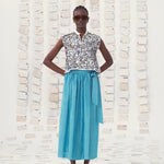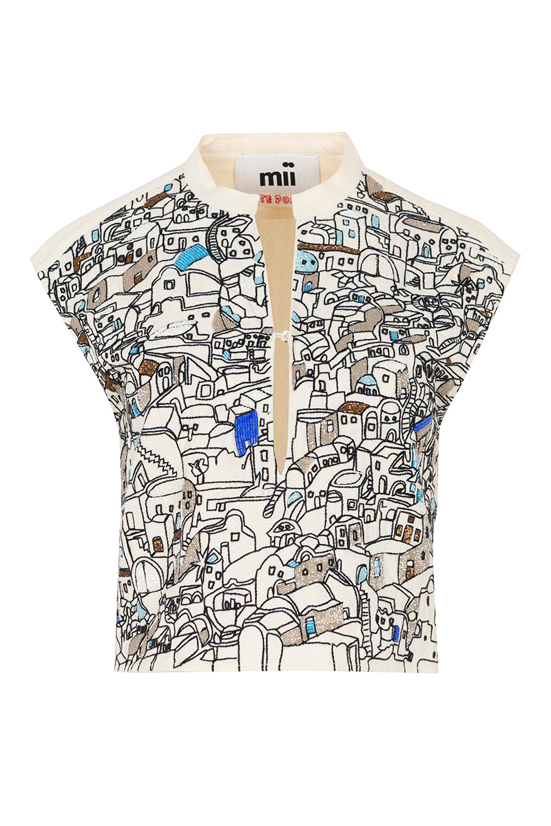 Hecho de popelín de algodón, el top Gaia está adornado en homenaje a los pueblos griegos de las islas cyclades. Bordados hechos a mano en vidrio. Añaden textura y brillo a esta pieza de alta costura. Composición: 100% algodón. Hecho a mano en la India.