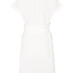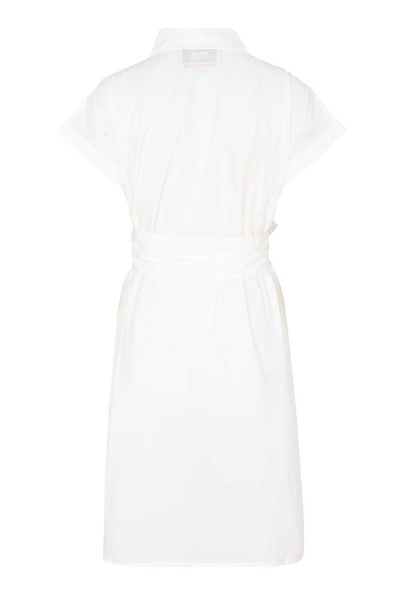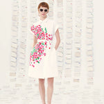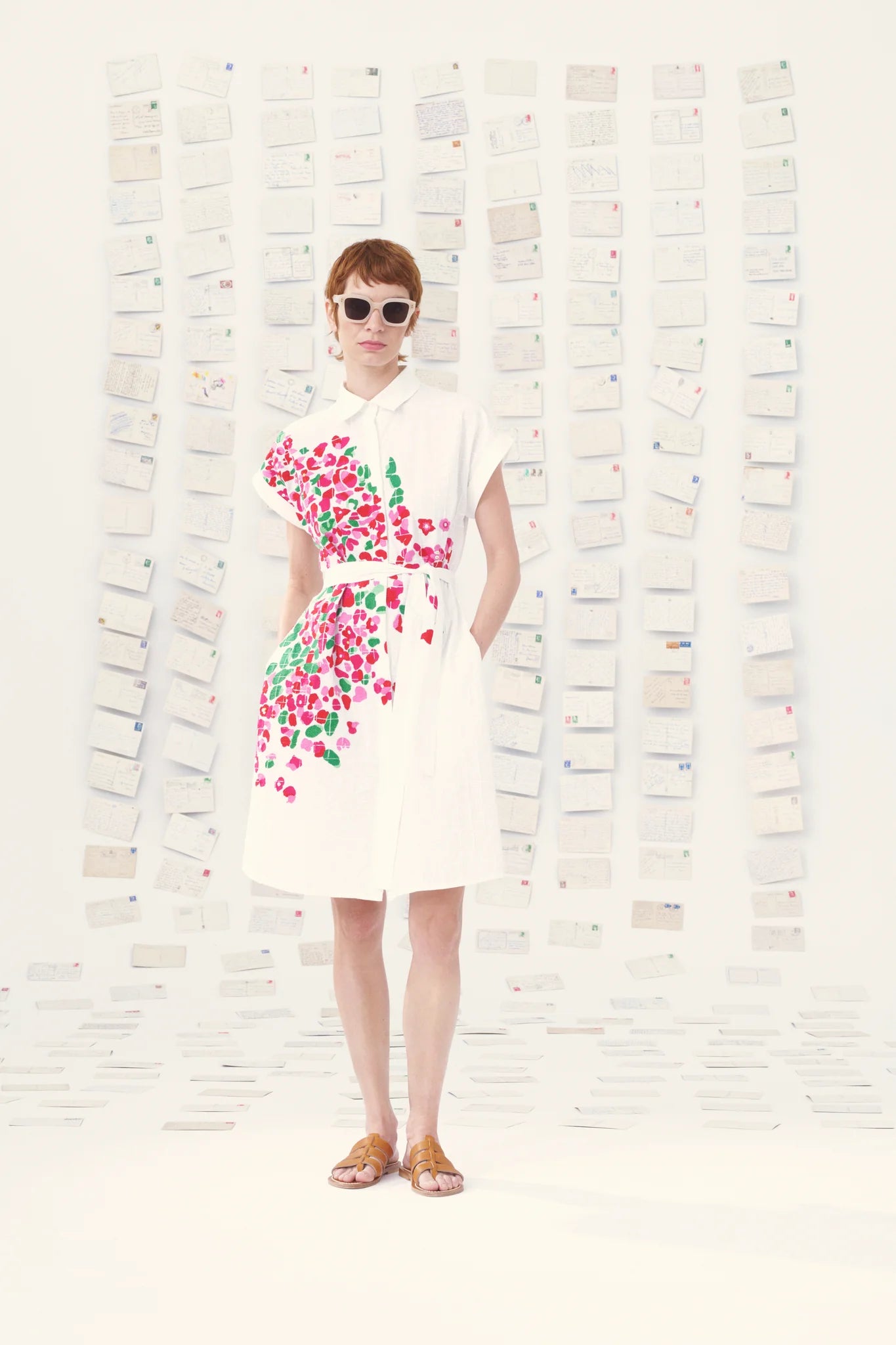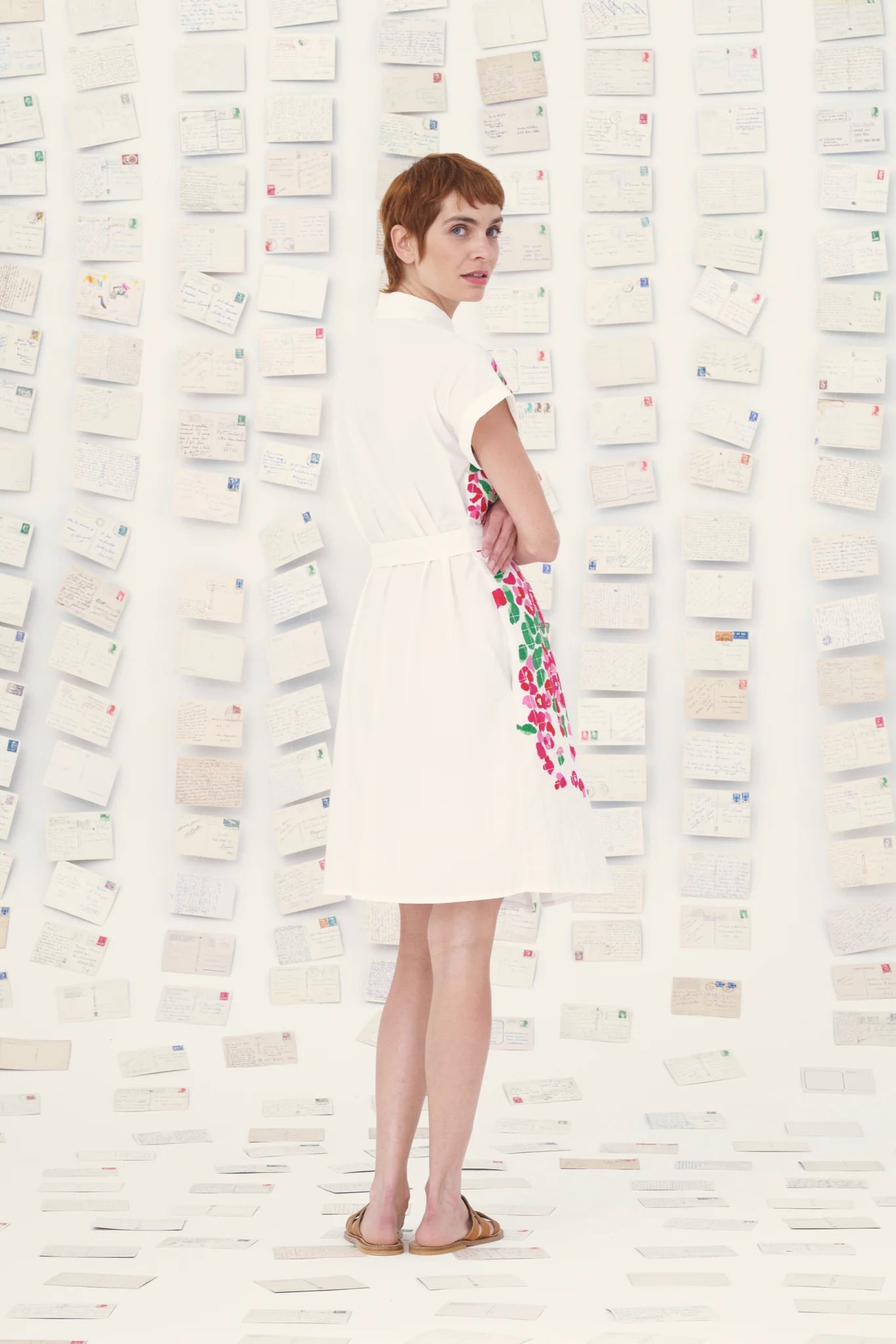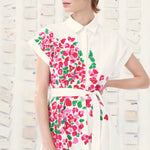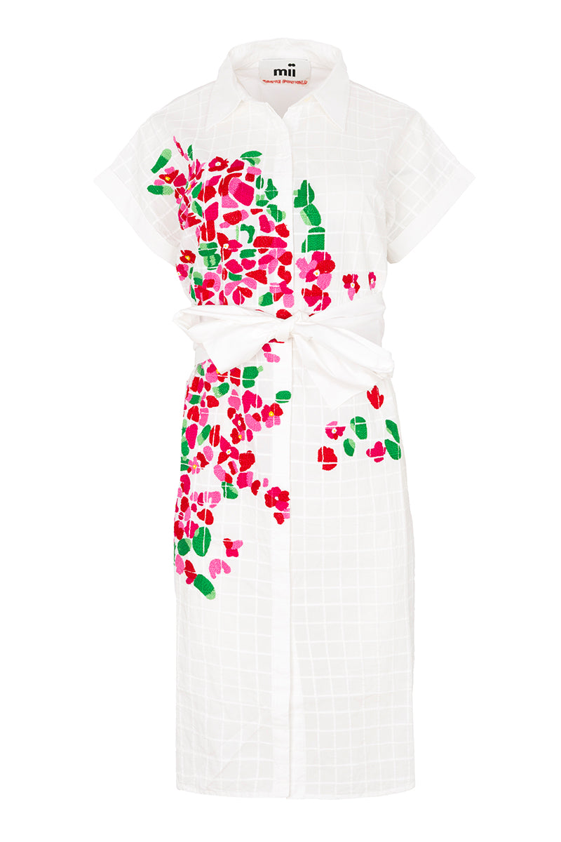 Vestido camisero en algodón blanco con detalle de cuadricula en el frontal y liso en la parte trasera. Manga ranglán. Confeccionado en algodón, está adornado con buganvillas bordadas en tonos fucsia, rosas y verdes. Los detalles bordados a mano aportan textura y refinamiento a la prenda. Cierre con botones hasta abajo. Posibilidad de llevarlo con cinturón. Composición: 100% algodón.