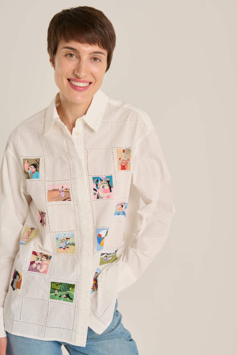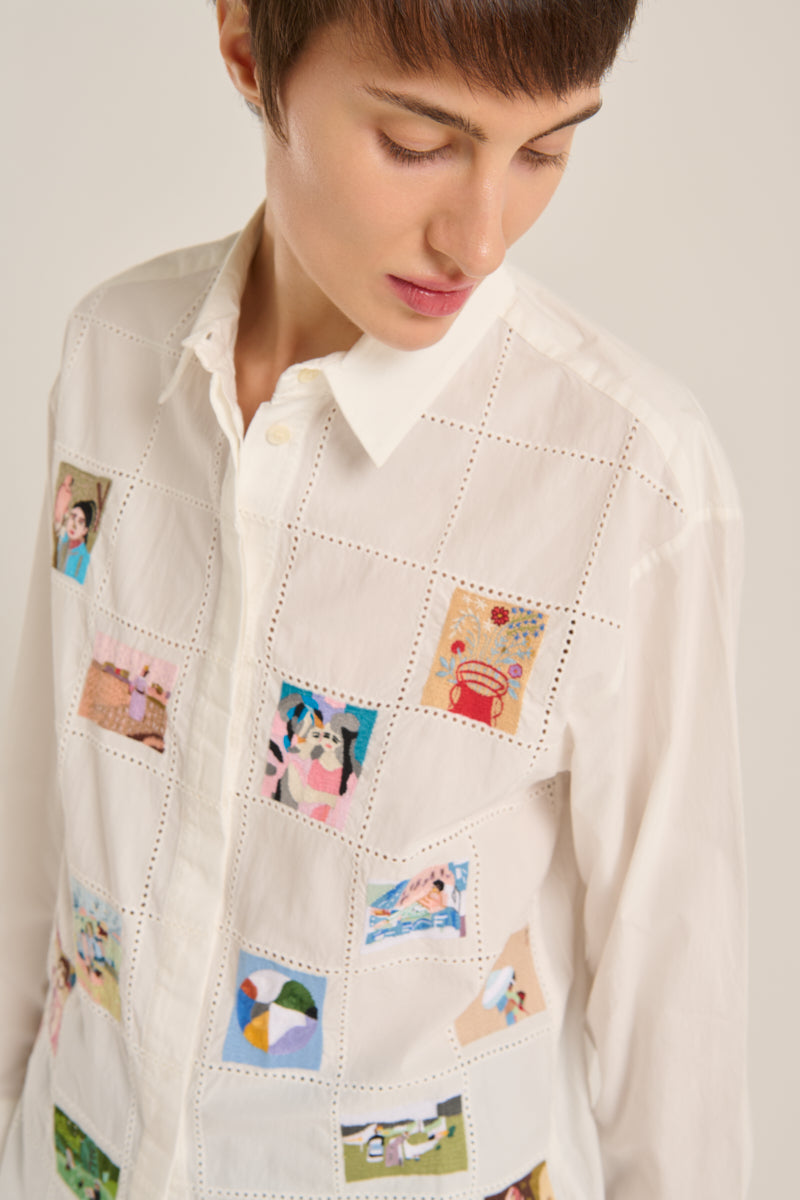 Camisa blanca de la colección “ surrealisme” de la firma Mii . Cuello camisero, manga larga y cierre frontal con botones al tono y tapilla. Bordado suizo formando cuadrículas y detalles de cuadros del surrealismo bordados en multicolor. Composición: 100% algodón.