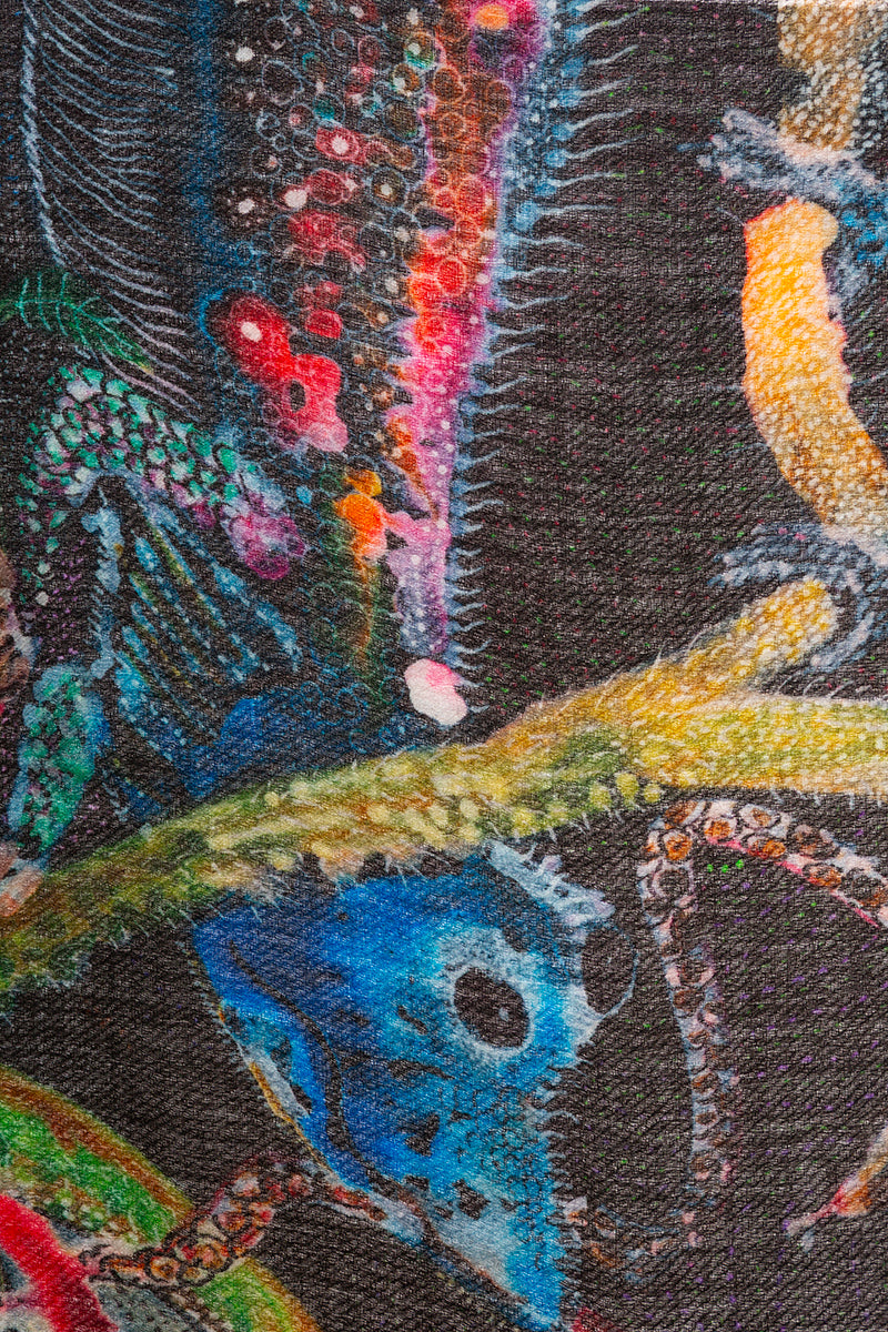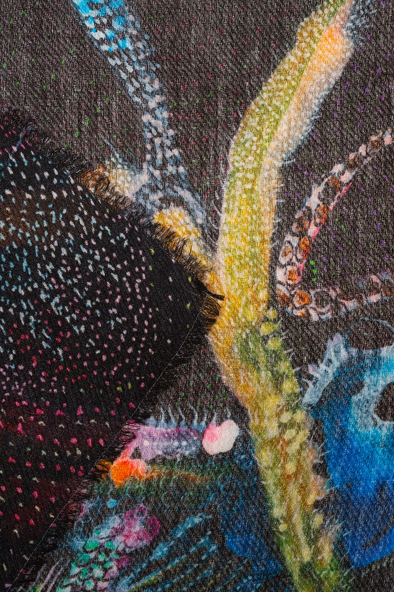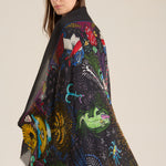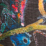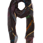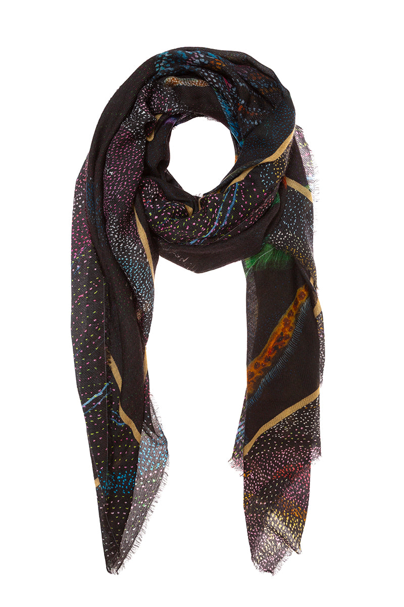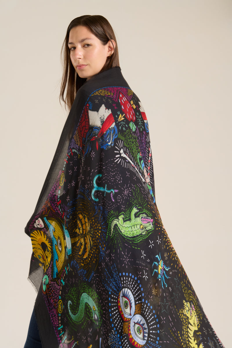 Pañuelo de la marca italiana Faliero Sarti. Modelo Monkey. Estampado en tonos azules, verdes, ocres y rojos nos descubren la estampa de un mono en su jungla de colores vibrantes. Hecho en Italia. Composición: 90% Lana, 10% Cashmere. Tamaño: