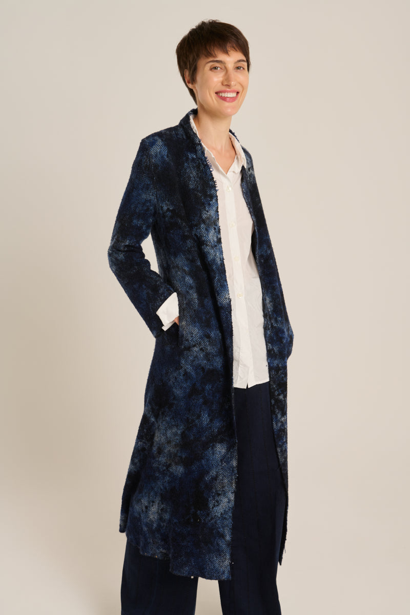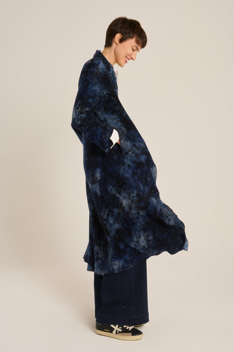 Abrigo largo de punto de la firma italiana Avant Toi en tonos azul midnight. Abrigo sin botones. Desflecado en cuello y parte delantera. Bolsillos laterales. Composición: 95% lana virgen 5% seda. Hecho en Italia. Tallaje Italiano.