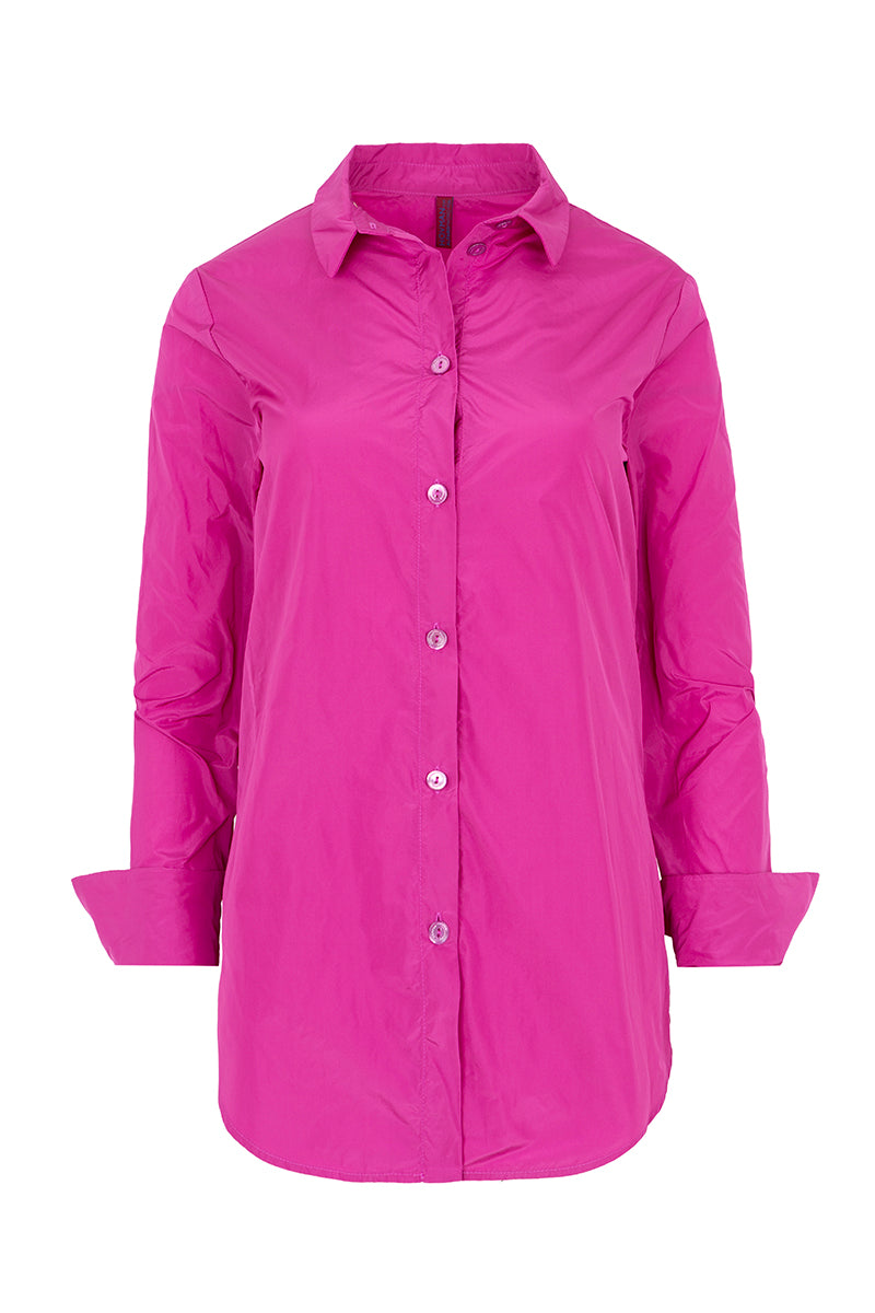Camisa de tejido tecnológico recta con cuello camisero, botones al tono y puño doble. Color frambuesa . Composición: 100% Poliéster. Este tejido no se puede planchar. Tallaje alemán.
