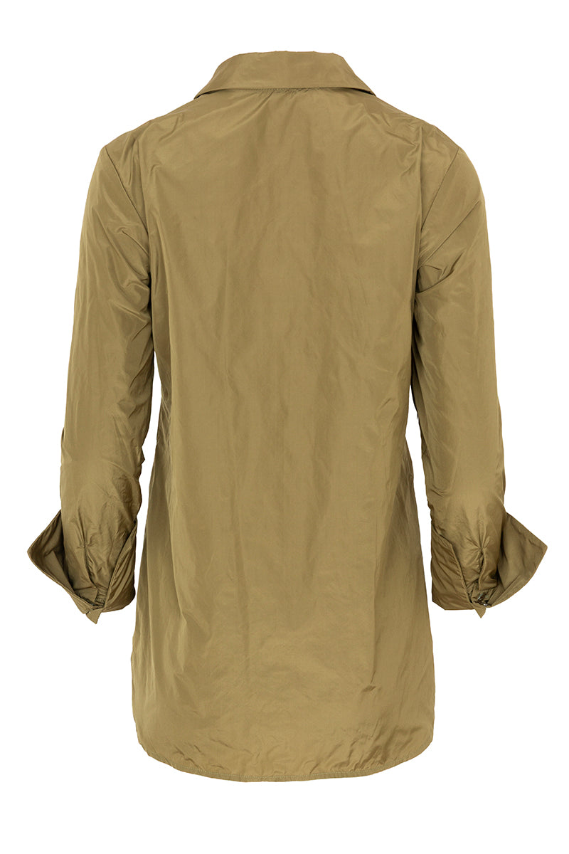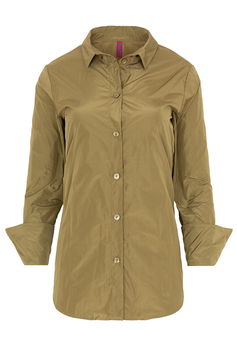 Camisa de tejido tecnológico recta con cuello camisero, botones al tono y puño doble. Color verde bosque. Composición: 100% Poliéster. Este tejido no se puede planchar. Tallaje alemán.
