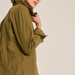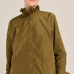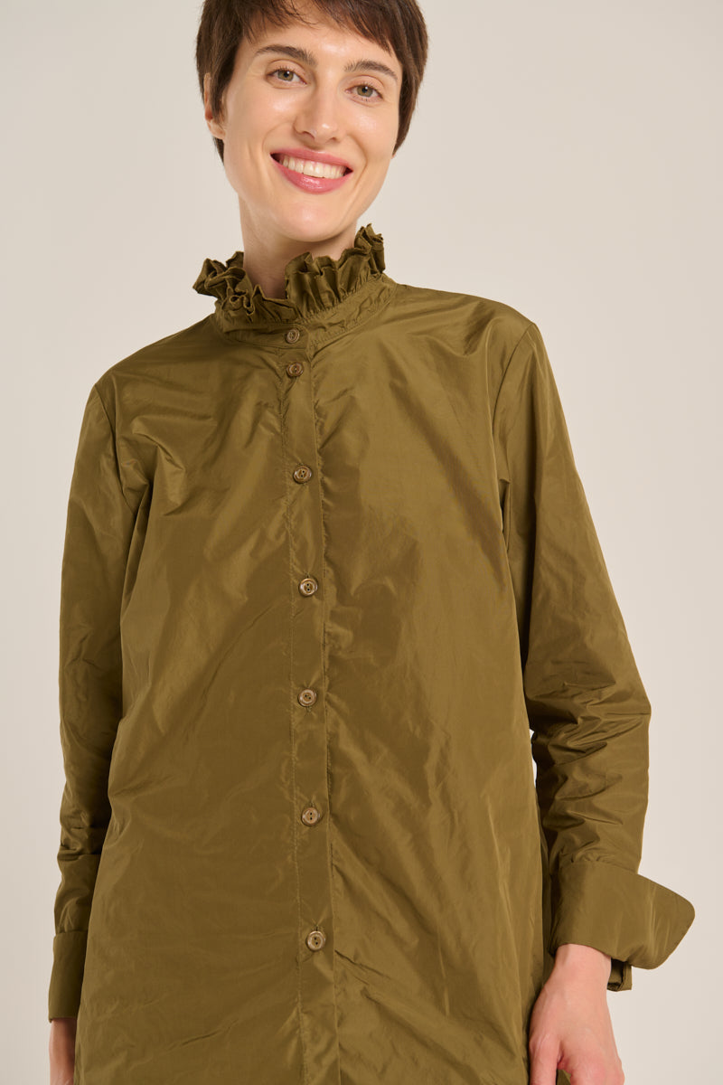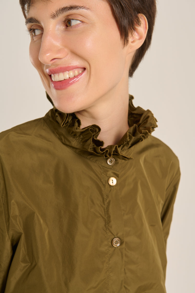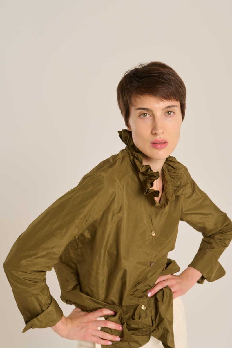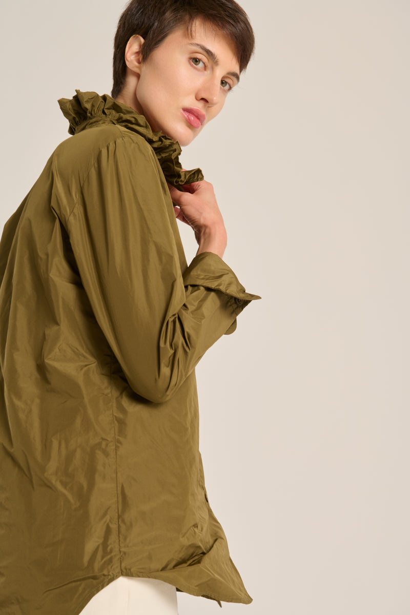 Camisa de tejido tecnológico con cuello de doble volante, botones al tono y puño doble redodeado. Color verde kaki. Composición: 100% Poliéster. Este tejido no se puede planchar. Tallaje alemán.