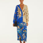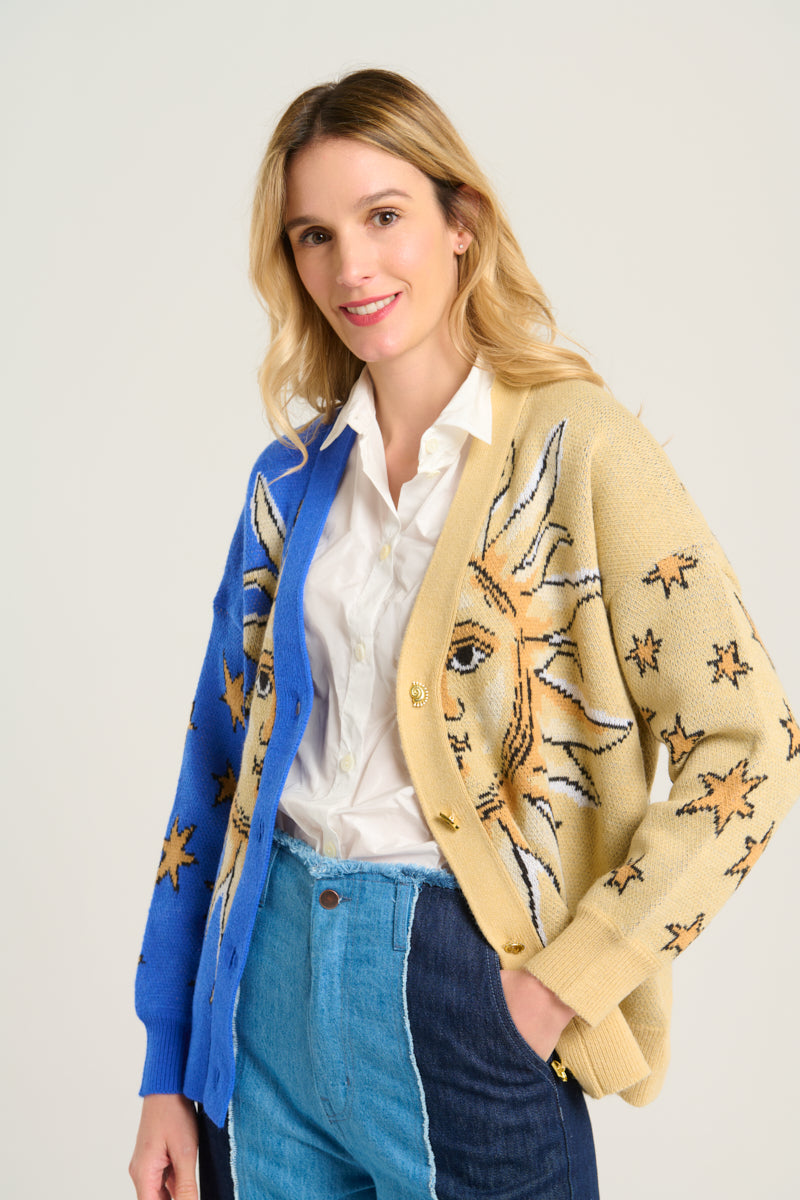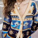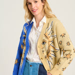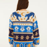 Chaqueta tipo over de la firma Farm Rio escote pico. Estampado cara solar con estrellas en tonos azules y mostaza. Cierre delantero con botones decorativos dorados diferentes.